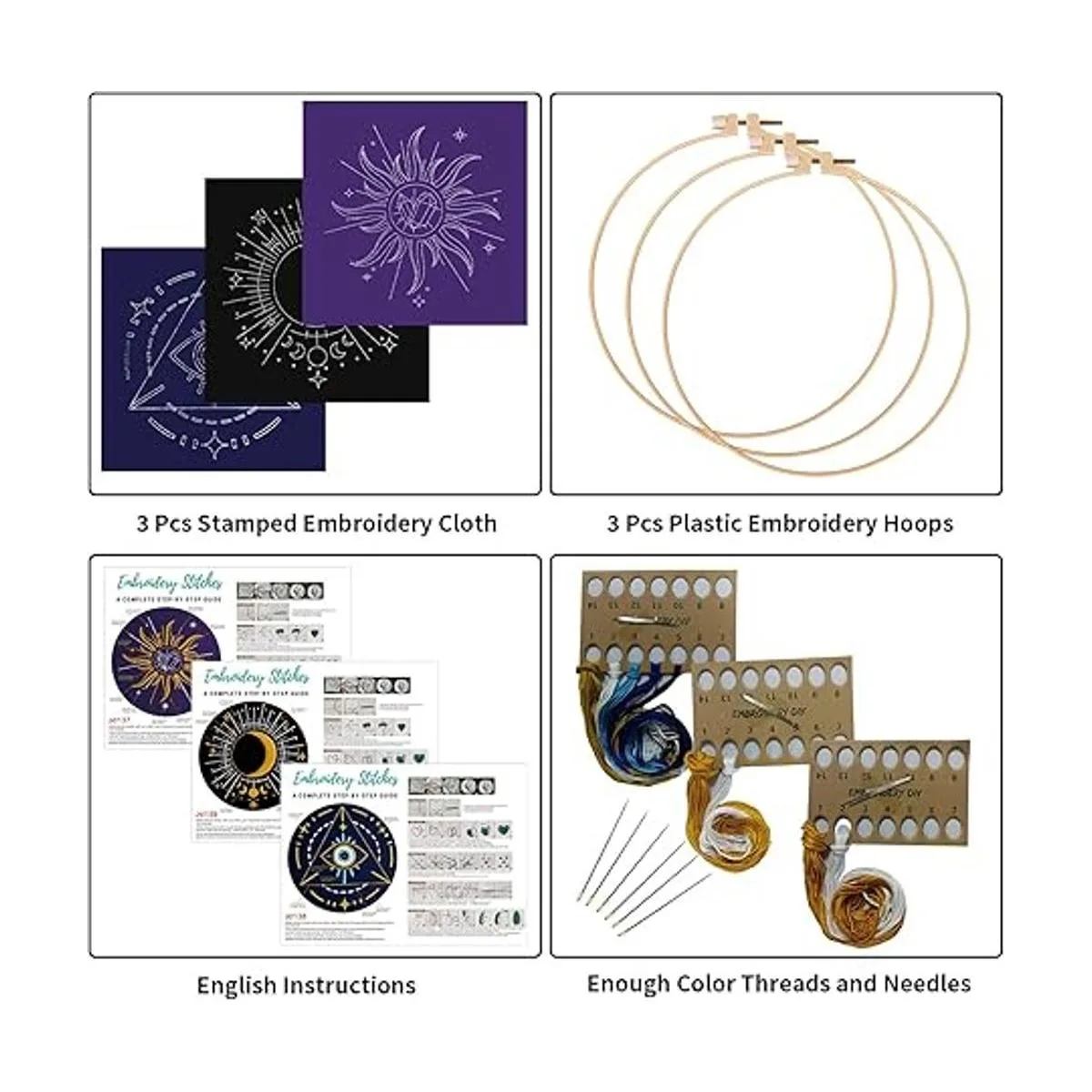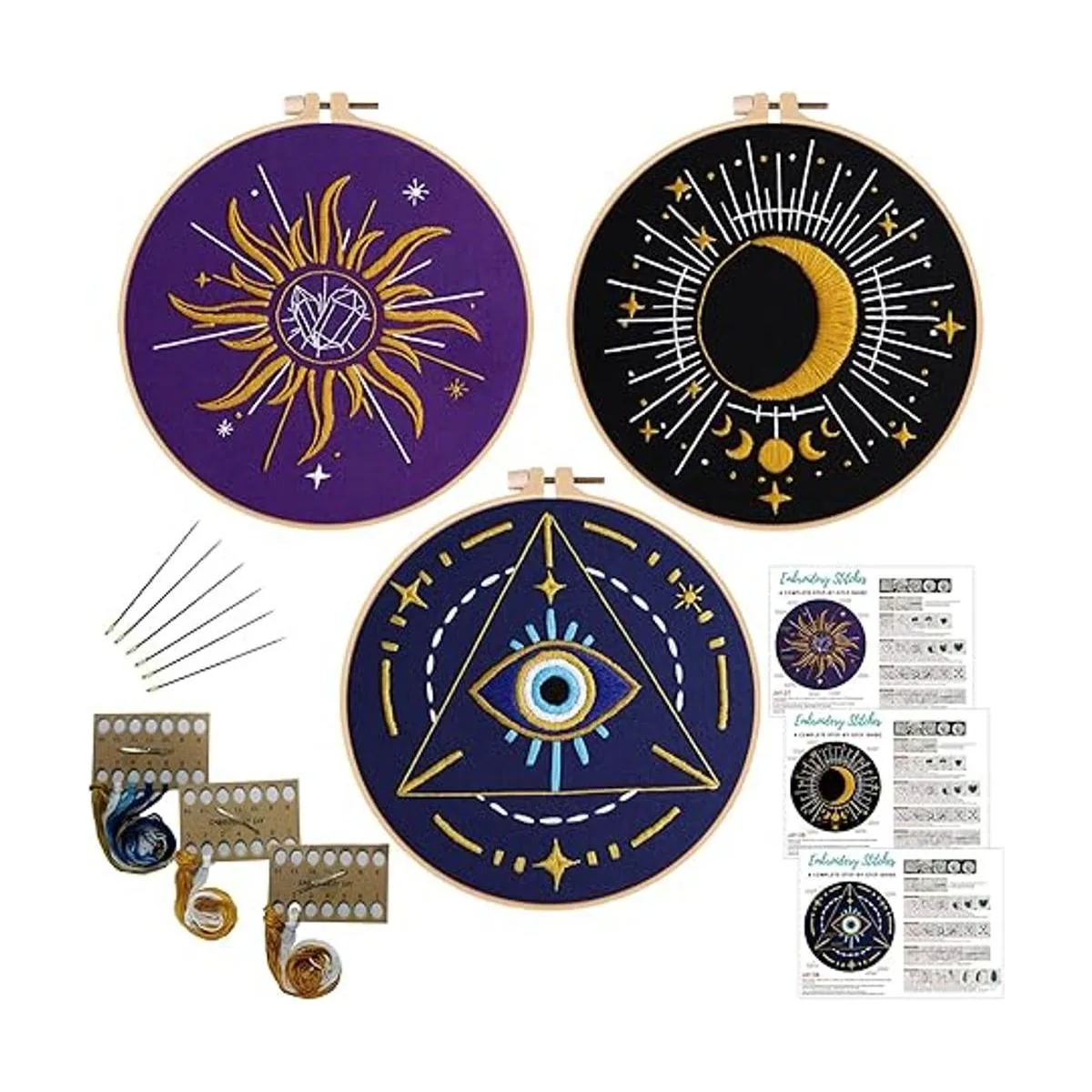 Louise Maelys Juego de 3 kits de bordado de tarot para principiantes con patrón de sol y luna, mal de ojo, kit de punto de cruz para adultos, kits de punto de aguja de bricolaje