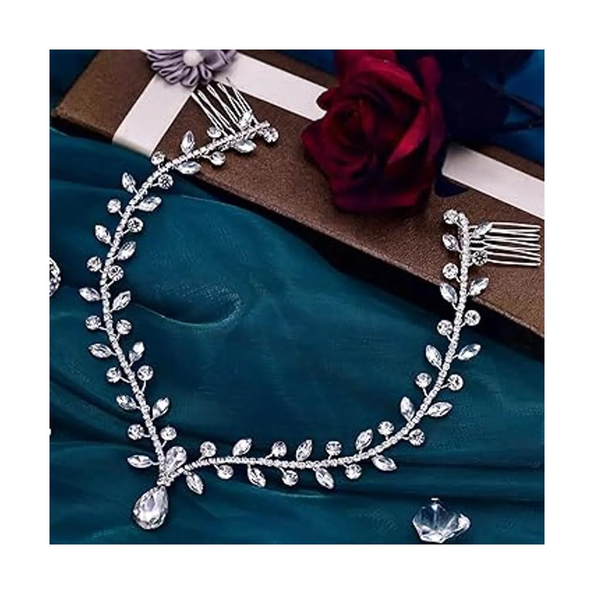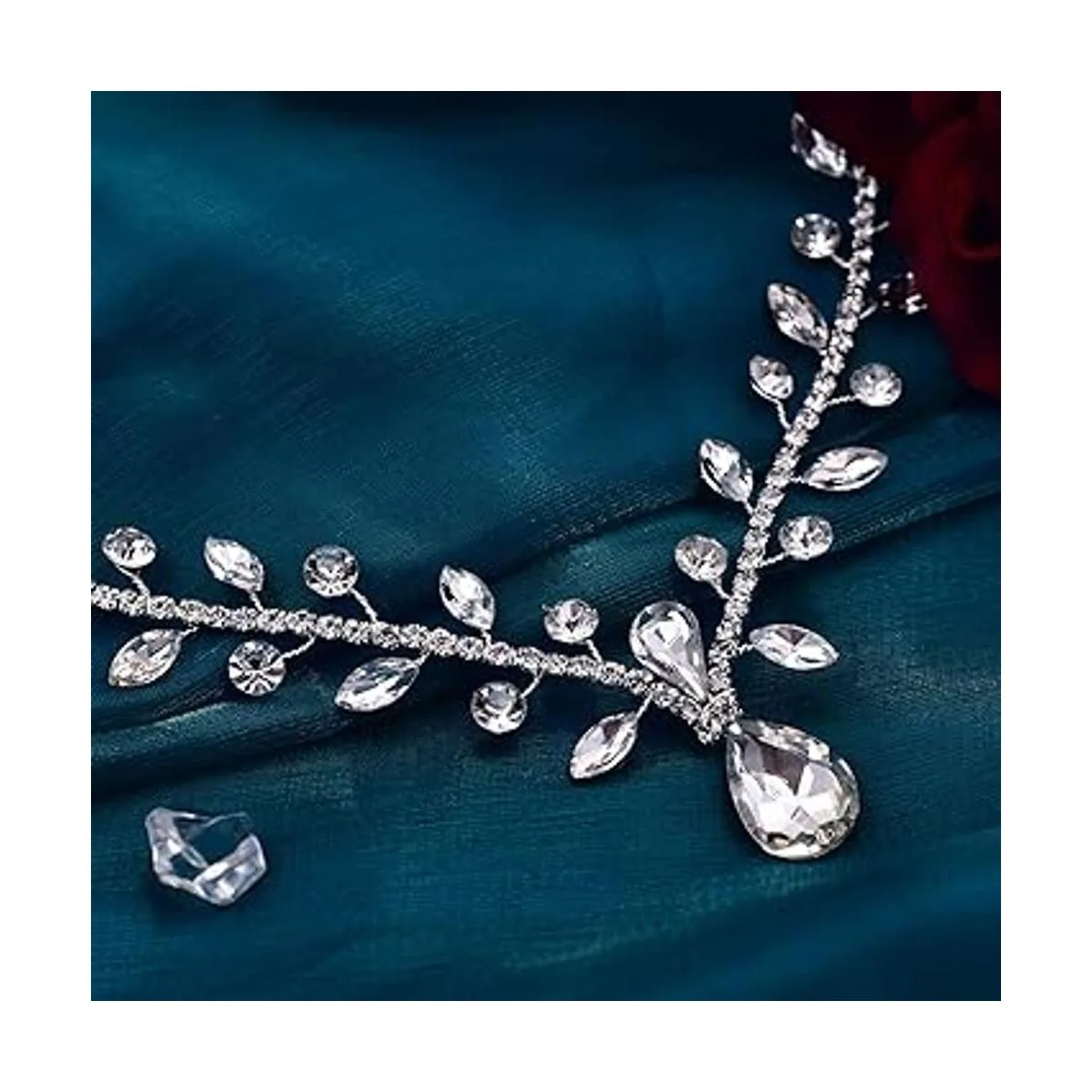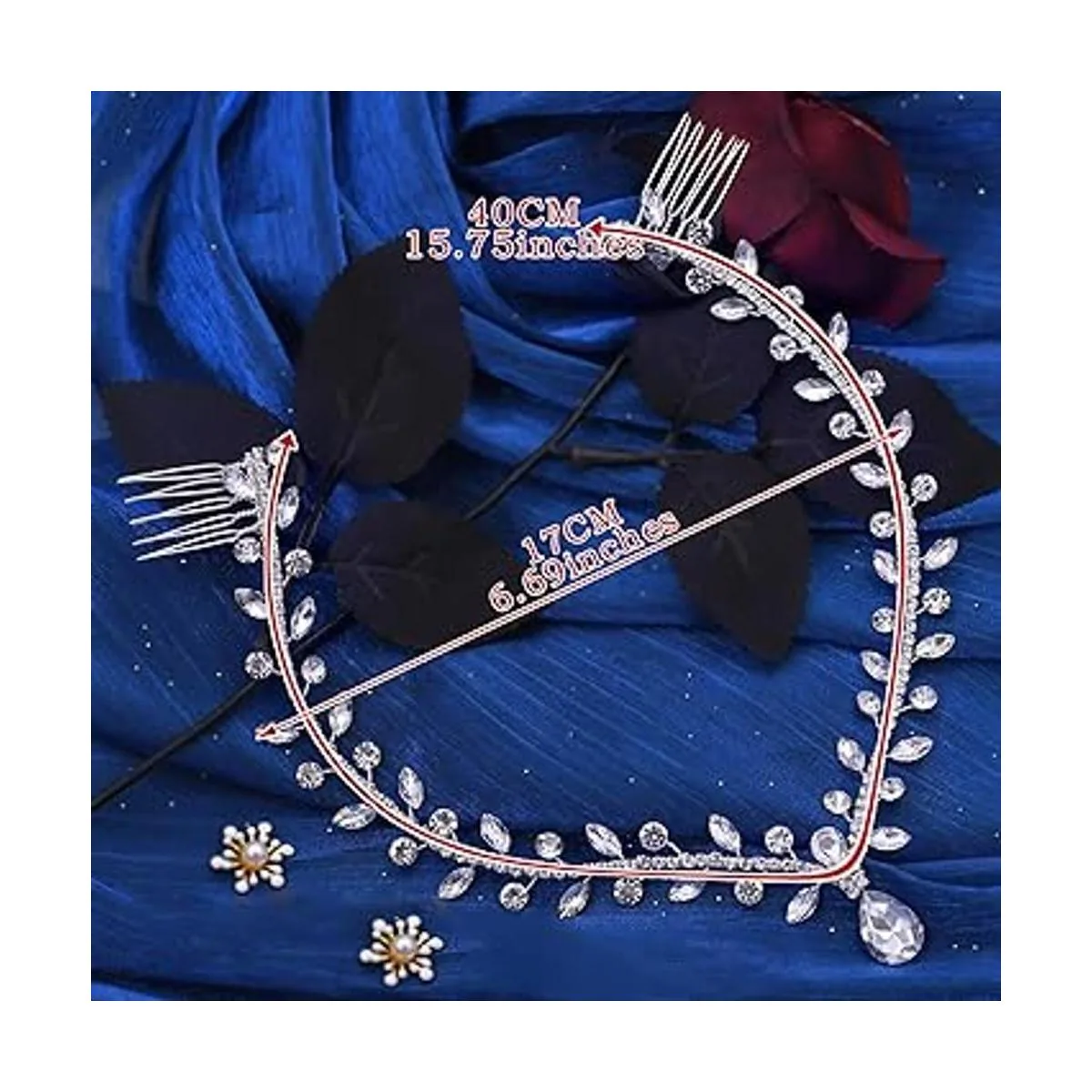 Características: El diseño de la diadema de boda para mujer es simple y generoso, la delicada forma de ramas y hojas te da una sensación estética única, lo que te hace más hermosa y encantadora, el clip de cadena para la cabeza está diseñado con lágrimas, elegante y brillante. Adecuado para todas las ocasiones de peinado y estaciones.