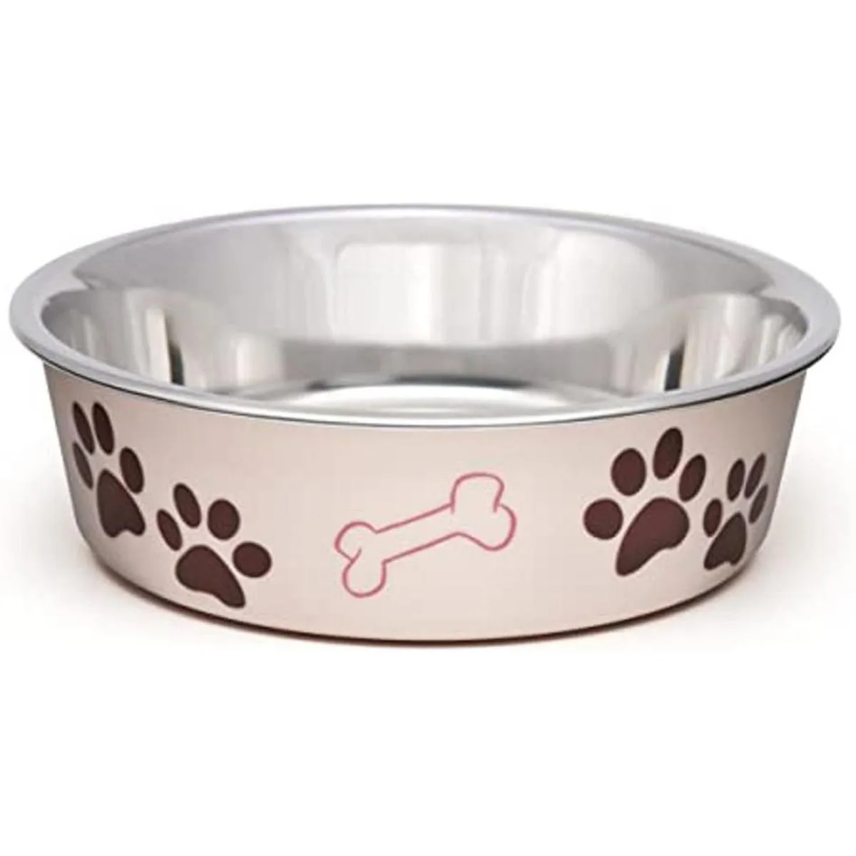 Cuenco para perro de acero inoxidable con diseño de huesos y huellas de pata.