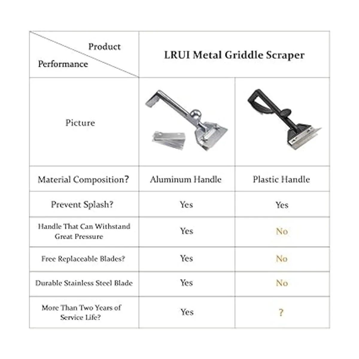 Peso ligero y más eficaz: el rascador de parrilla tiene un buen peso y es muy eficaz, es un gran accesorio de parrilla de piedra negra, el rascador de parrilla de aluminio fundido pesado funciona muy bien y limpia la plancha de parrilla muy fácil, limpiador de parrilla como los profesionales de los restaurantes Viene con 5 cuchillas de acero inoxidable de 6 pulgadas para un servicio duradero