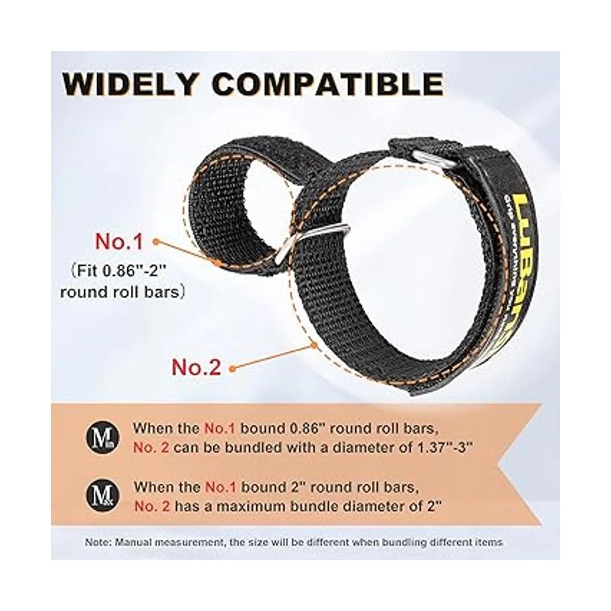 La correa de montaje ajustable se adapta a artículos de hasta 0.86 a 2 pulgadas de diámetro. Nota: para diferentes artículos incluidos, el tamaño variará