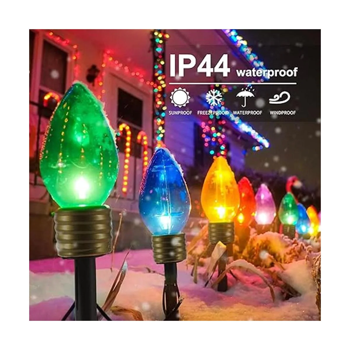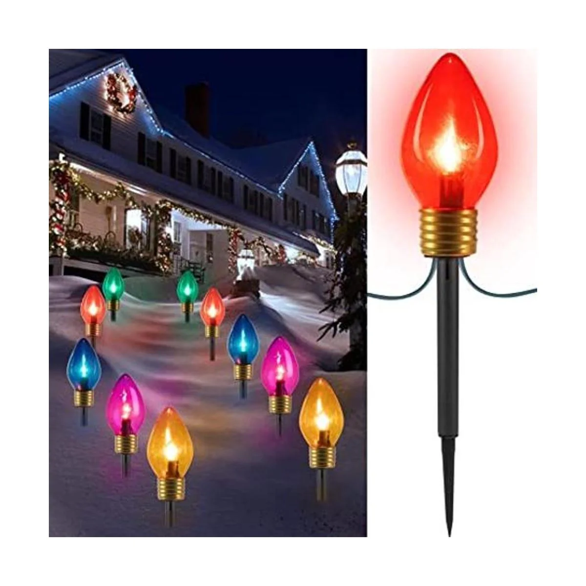 El producto incluye: juego de 2 luces de Navidad vienen con 10 bombillas C7, 10 bombillas jumbo C9 multicolor. Los colores de la carcasa son naranja, rojo, azul, verde, amarillo y tienen el efecto de belleza cuando los iluminan. Los juegos de luces de Navidad vienen con 2 fusibles de repuesto y 4 bombillas C7 de repuesto para un fácil reemplazo. Increíbles luces de estaca de paisaje, perfectas para decoraciones residenciales, comerciales y de vacaciones