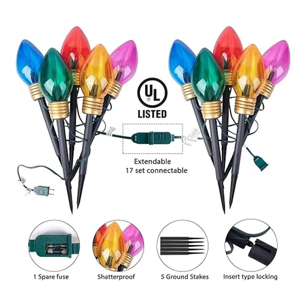 El producto incluye: Tira de luces con alambre verde de 8.5 pies de largo con 5 bombillas C7, 5 bombillas jumbo multicolor C9, y este juego de luces de Navidad viene con 1 fusible de repuesto y 2 bombillas C7 de repuesto para facilitar el reemplazo. Increíbles luces de estaca para paisajes, perfectas para decoraciones residenciales, comerciales y de festividades.