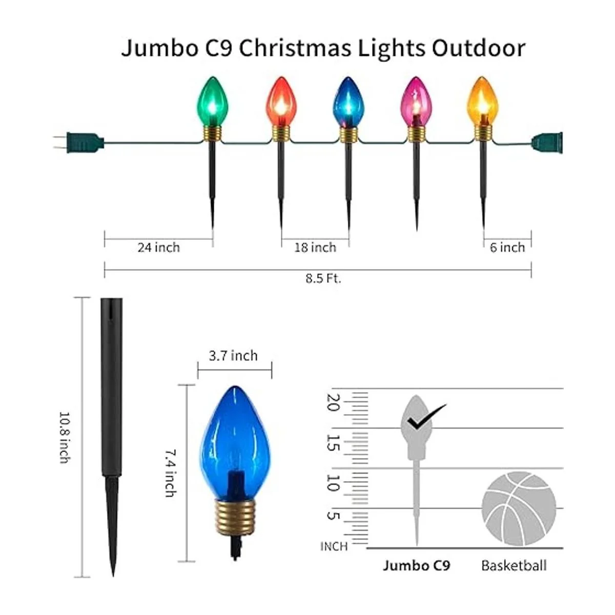 Luces de Navidad Jumbo C9, decoraciones de césped para el exterior con estacas de señalización para caminos, tira de luces C7, tamaño de 8.5 pies, mini tira de luces con purpurina, tamaño Jumbo, multicolor, 5 luces