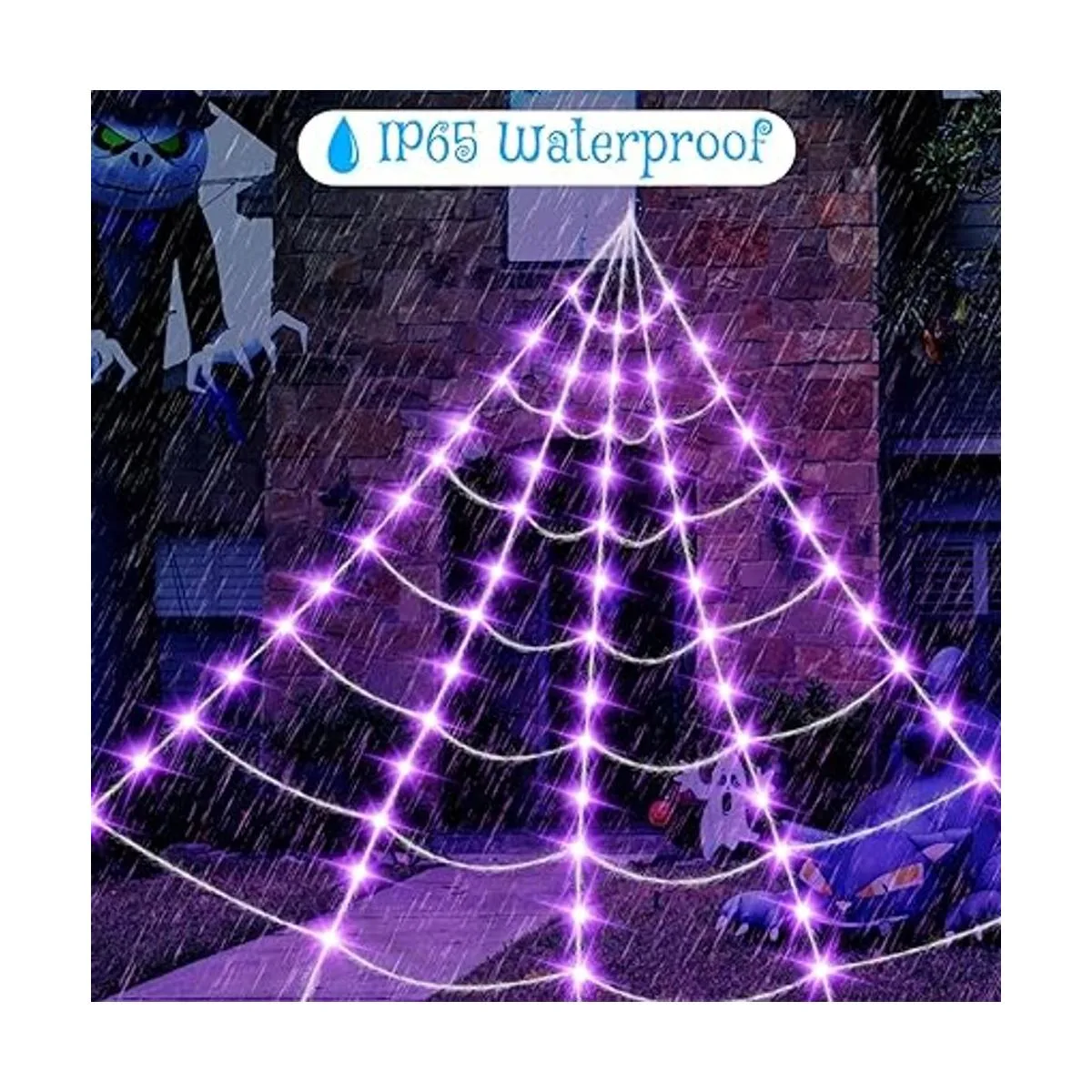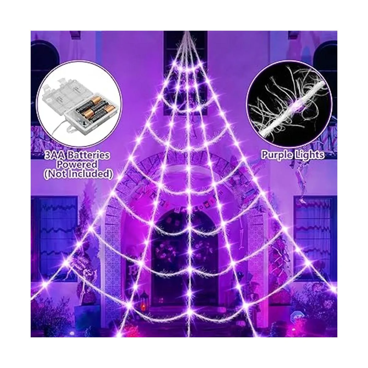 Ampliamente utilizado: hay 100 LED morados distribuidos uniformemente en toda la telaraña peluda de 16 pies de diámetro. Se puede colgar fácilmente en paredes, esquinas, techos, ventanas, cortinas, pasillos, chimeneas, escaleras, puertas, pérgolas, vallas y mucho más. Configura luces de telaraña de Halloween para acentuar y crear un ambiente de Halloween.