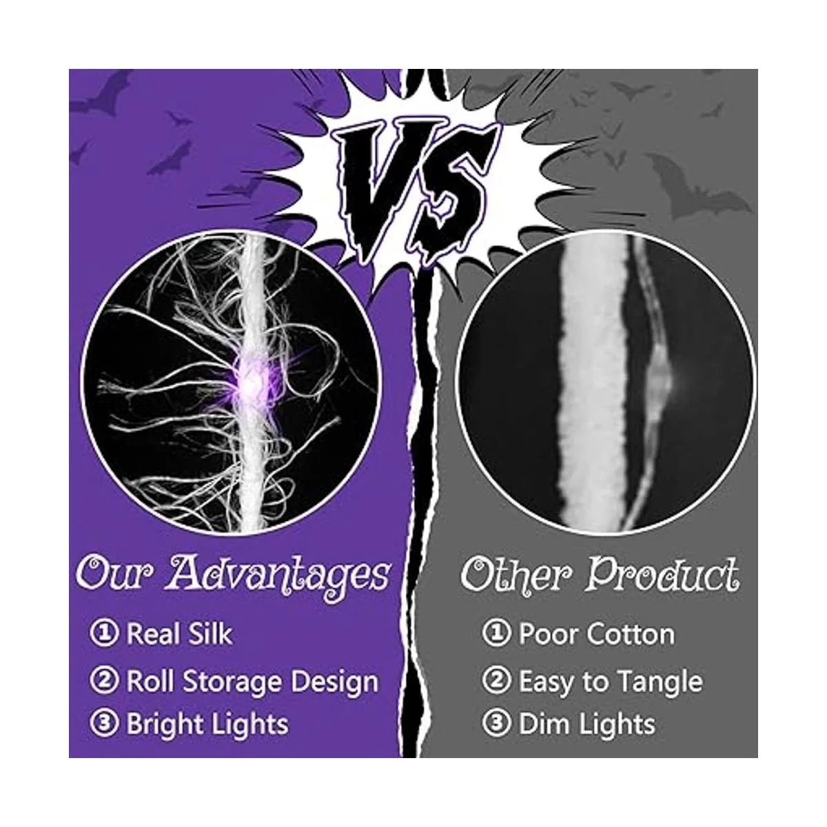 Seda real y luces LED: el compartimento de la batería de la lámpara de telaraña está hecho de alambre de cobre impermeable y algodón. Nuestro producto adopta el concepto de producción de una telaraña realista, creando una imagen de aspecto de telaraña peluda ultra realista. Es una impresionante decoración de Halloween con pequeñas luces LED moradas para crear mejor un ambiente de Halloween.