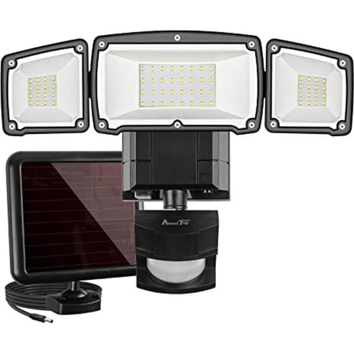 Luces solares ultrabrillantes para exteriores: la luz de seguridad solar AmeriTop con diseño de tres cabezales, produce hasta 1600 lm 6000 K de alto brillo y buena disipación de calor, que es mucho más brillante que otras luces solares LED similares. Es recargable por panel solar de alta eficiencia, alcanza la carga completa en unas horas. En comparación con otros paneles solares, todavía puede obtener una carga de baja corriente en los días nublados/lluviosos o en zonas donde la luz solar es insuficiente.