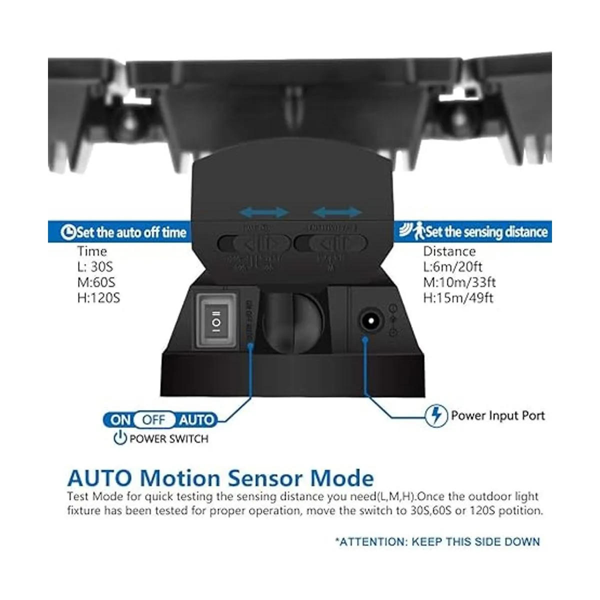Sensor de movimiento inteligente: la luz solar tiene sensor de luz diurna y movimiento. El modo automático desde el atardecer hasta el amanecer se enciende automáticamente para el tiempo predeterminado 30 s/60 s/120 s cuando se detectan personas u otros objetos vivos dentro de la zona de detección, y se apaga automáticamente después de que no se detecte más movimiento. Sensor de movimiento PIR integrado de nuestras luces solares, tiene un largo alcance de distancia y un amplio ángulo para detección de movimiento. El rango de detección y la sensibilidad son un 20 más alto que las luces solares generales, aportando la mejor experiencia de uso.