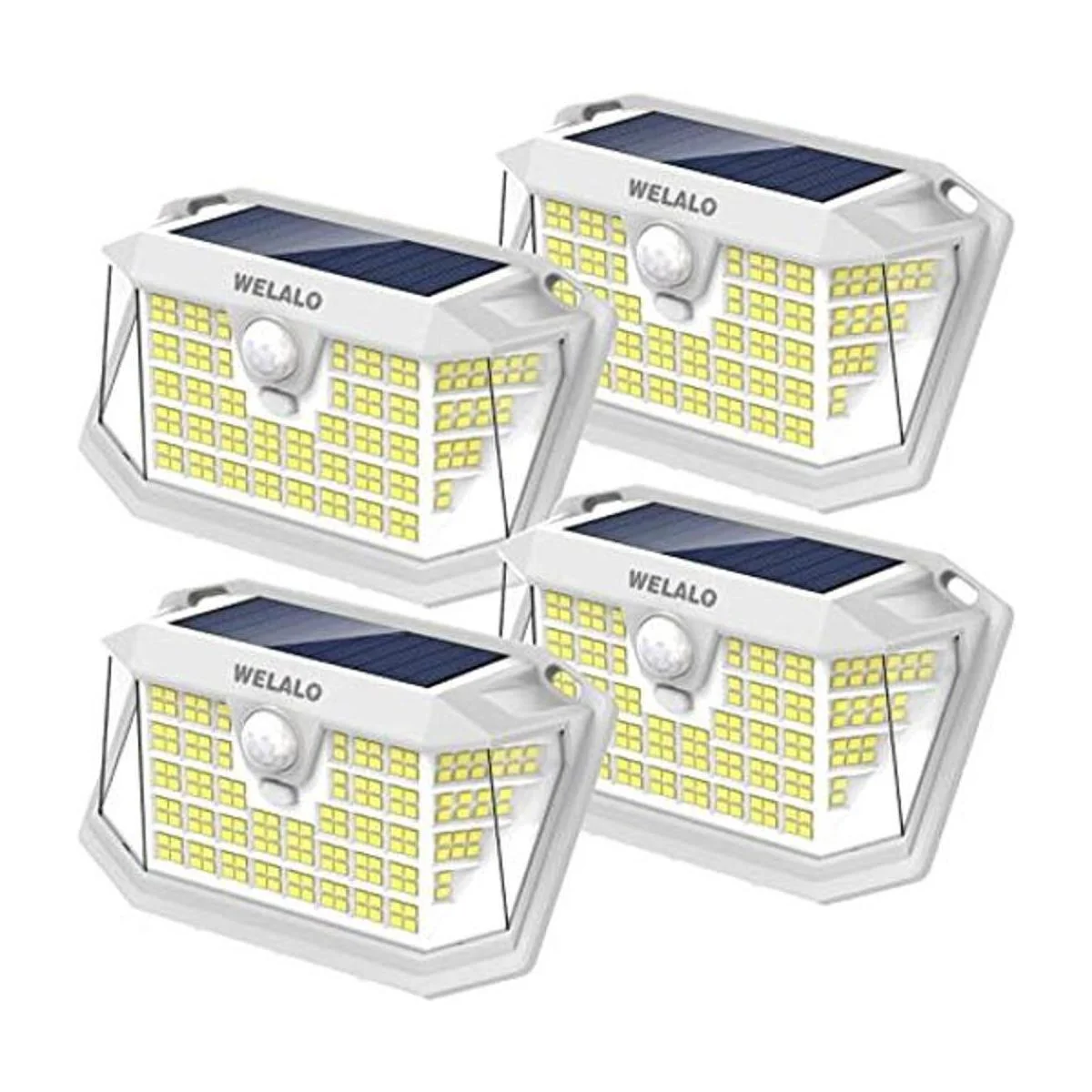 Luces solares de movimiento de 188 LED de color blanco frío: nuestras luces solares WELALO 188 LED de movimiento para exteriores con iluminación de gran angular de 270, proporcionando un súper brillo para una amplia zona y puede iluminar más tiempo, y coordinar bien con todos los diferentes estilos de decoración.
