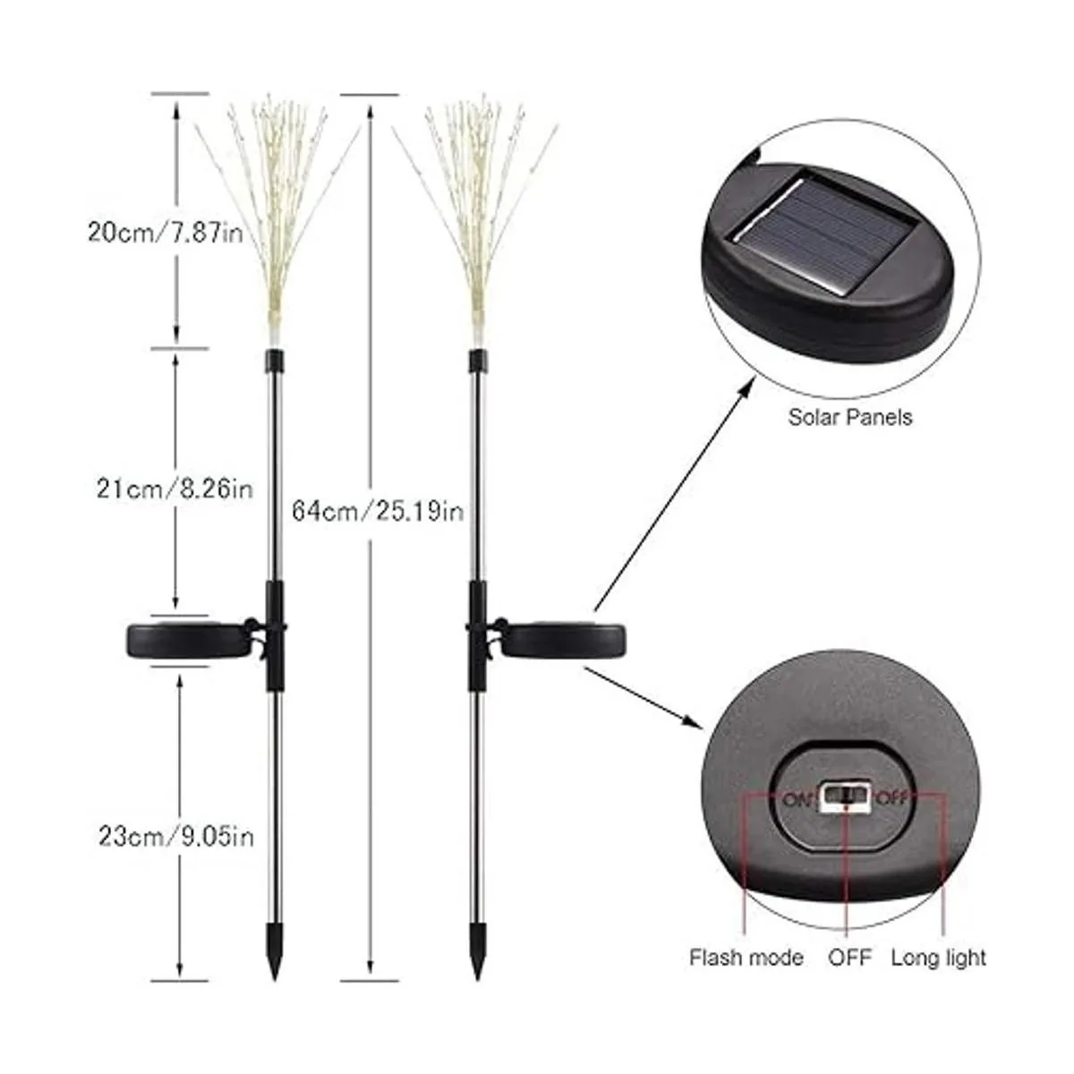 Fácil instalación: simplemente conecta las luces de jardín al aire libre en el suelo, enciende el interruptor de la parte posterior del panel solar con 2 modos de iluminación de encendido/apagado antes de usar.