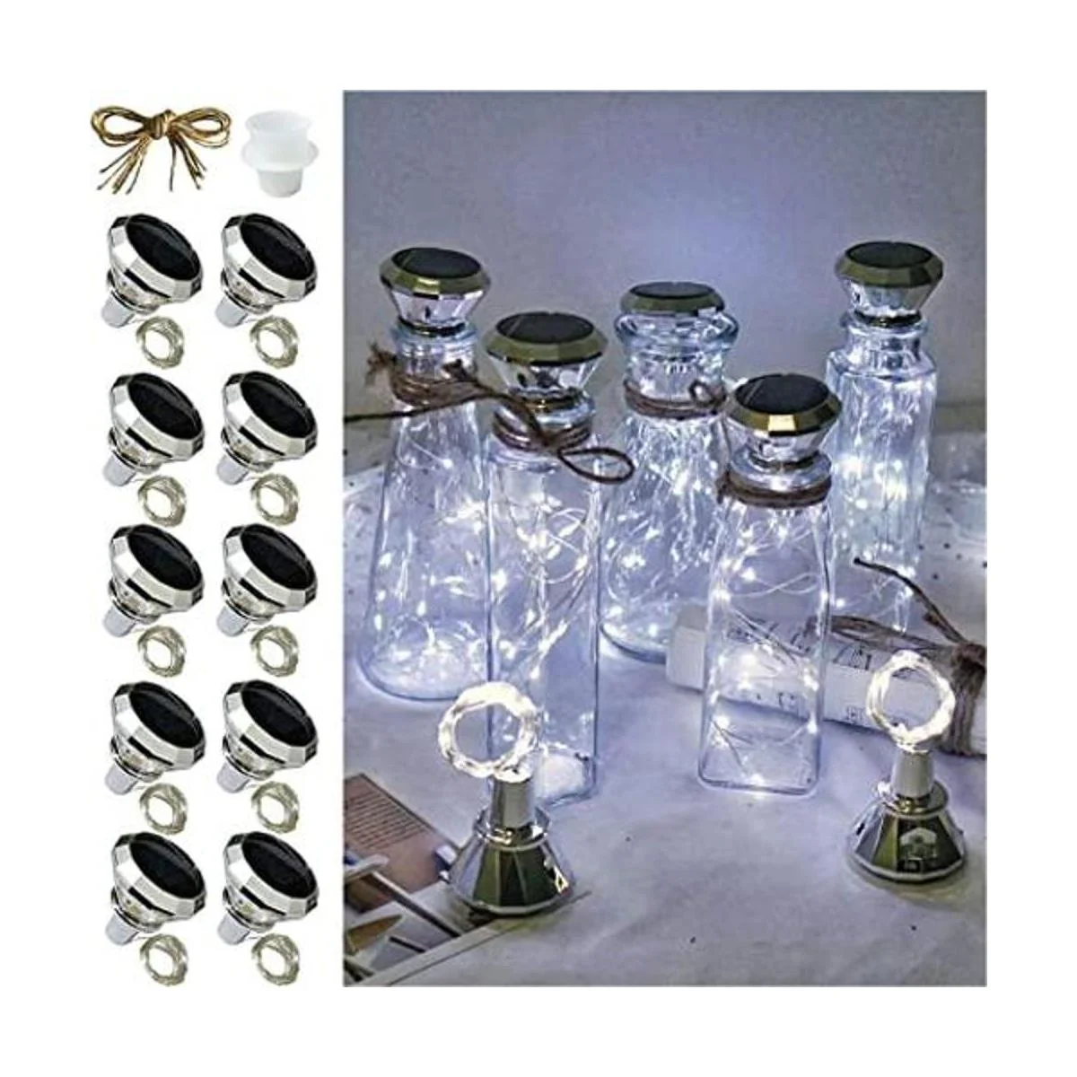 Luces solares para botella de vino, paquete de 10 luces de corcho de diamante, 20 LED al aire libre impermeable cadena de luces para jardín boda patio blanco frío