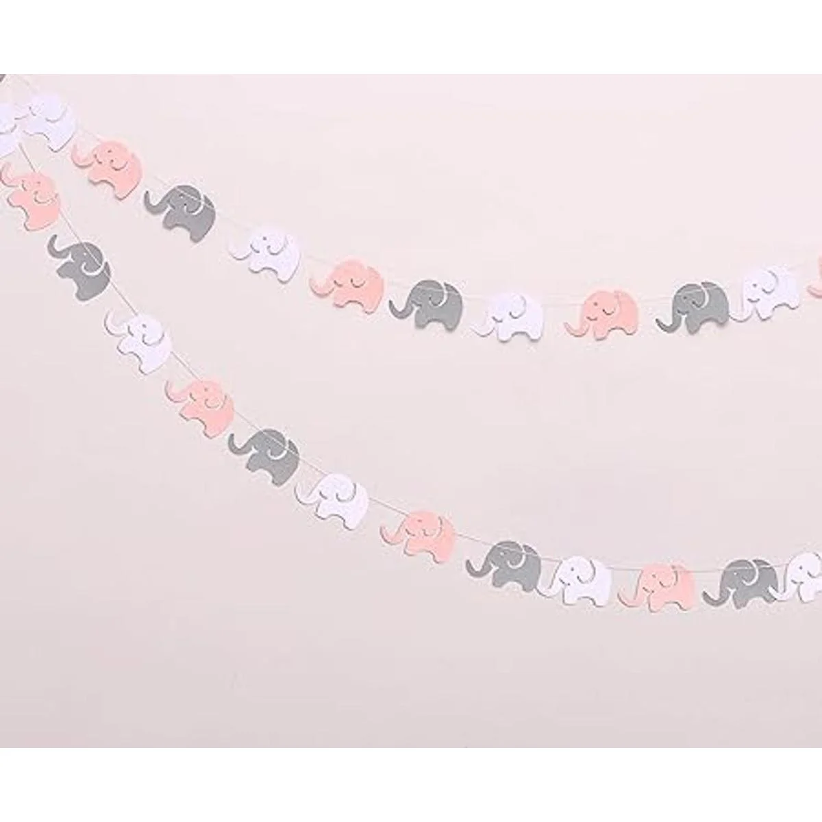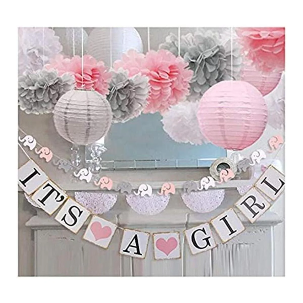 El paquete incluye: pancartas de niña, 9 pompones de flores de papel, 5 faroles de papel, guirnalda de elefante