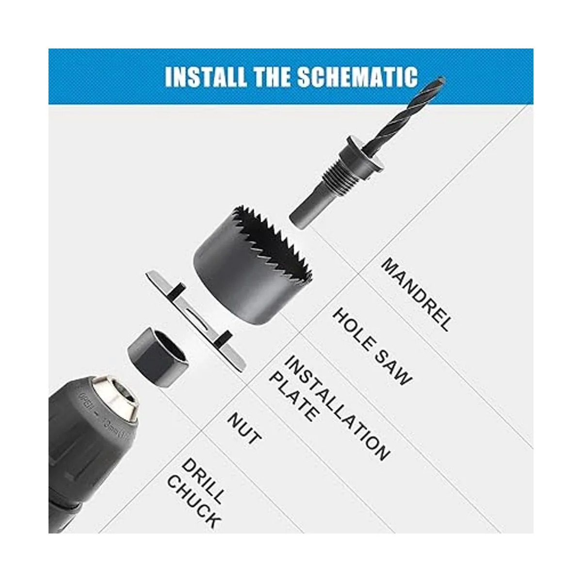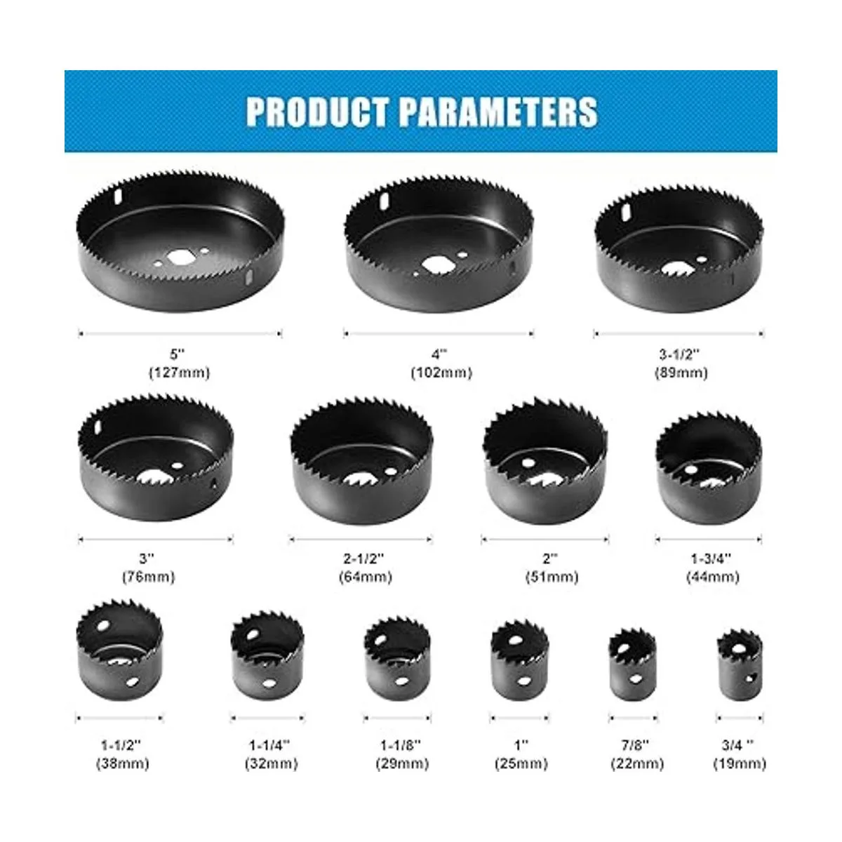 Dimensiones: incluye 13 sierras perforadoras con el tamaño de 0.748 in, 0.866 in, 0.984 in, 1.142 in, 1.260 in, 1.496 in, 1.732 in, 2.008 in, 2.520 in, 2.992 in, 3.504 in mm, 3.9 in. 0.079 in, 5.000 in, 2 mandriles, 1 llave hexagonal, 1 placa de instalación.