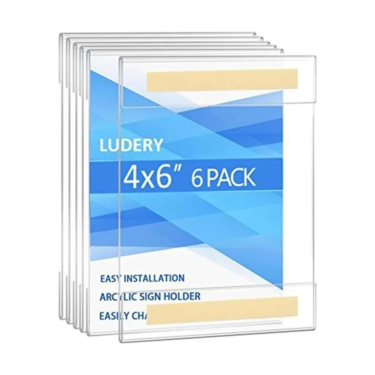 Ludery Soporte de pared de 3.9 x 5.9 in, marco de plástico transparente con cinta adhesiva 3M para oficina, hogar, tienda, restaurante, sin perforación, vertical paquete de 6