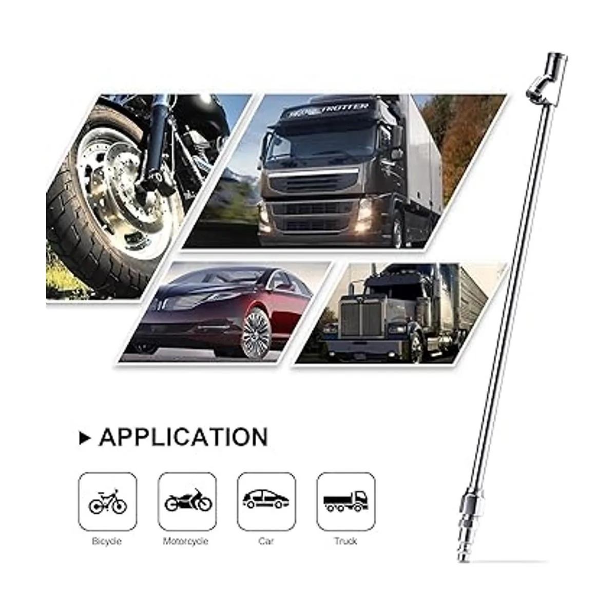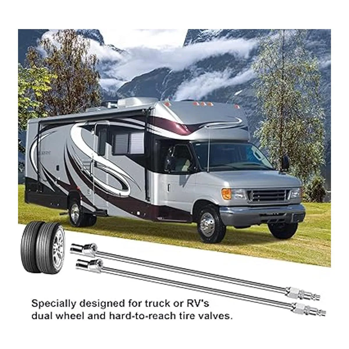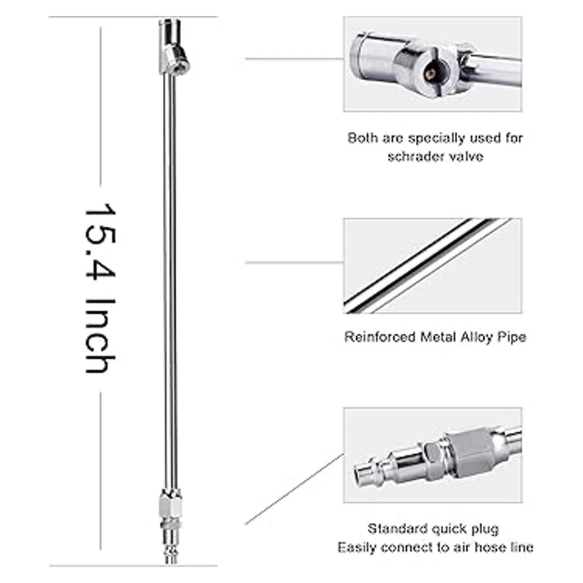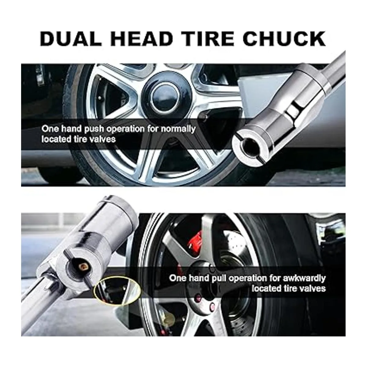 Alcance extendido y diseño de rosca interior de doble cabeza Barra de aire alargada de 12 pulgadas junto con diseño de bloqueo de rosca interior de calidad, especialmente diseñada para ruedas dobles de camiones o caravanas y válvulas de neumáticos de difícil acceso, portabrocas de cabeza recta para neumáticos interiores y portabrocas de 30 grados mejor para rueda exterior, colócalo en el vástago de la válvula del neumático y luego empuja y inclínalo para garantizar que no haya fugas de aire y fácil operación con una sola mano.