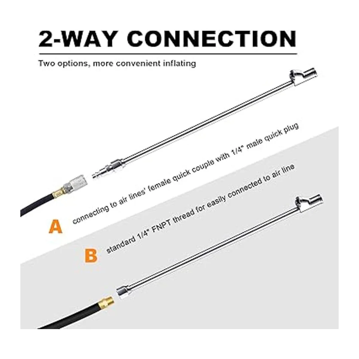 Fácil conexión de 2 vías: este portabrocas de aire premium cuenta con una rosca FNPT hembra de 1/4 pulgadas para conectar fácilmente a las líneas de aire del compresor de aire para facilitar el inflado de neumáticos. También incluye un enchufe rápido macho estándar de 1/4 pulgadas, para una conexión cómoda y rápida a las líneas de aire hembra rápido.