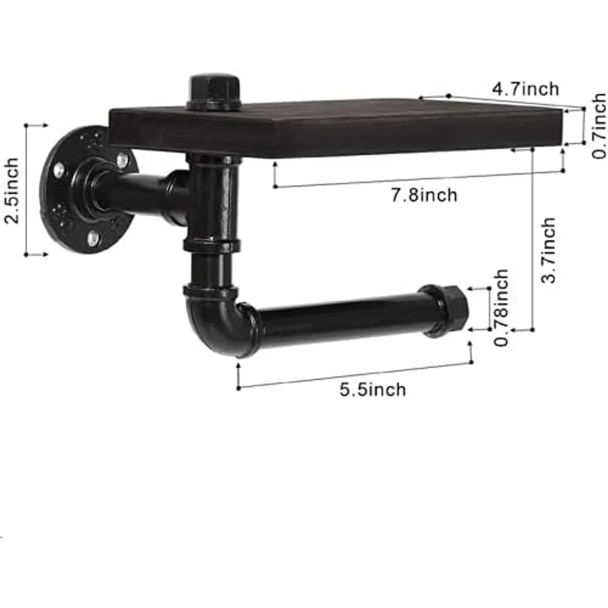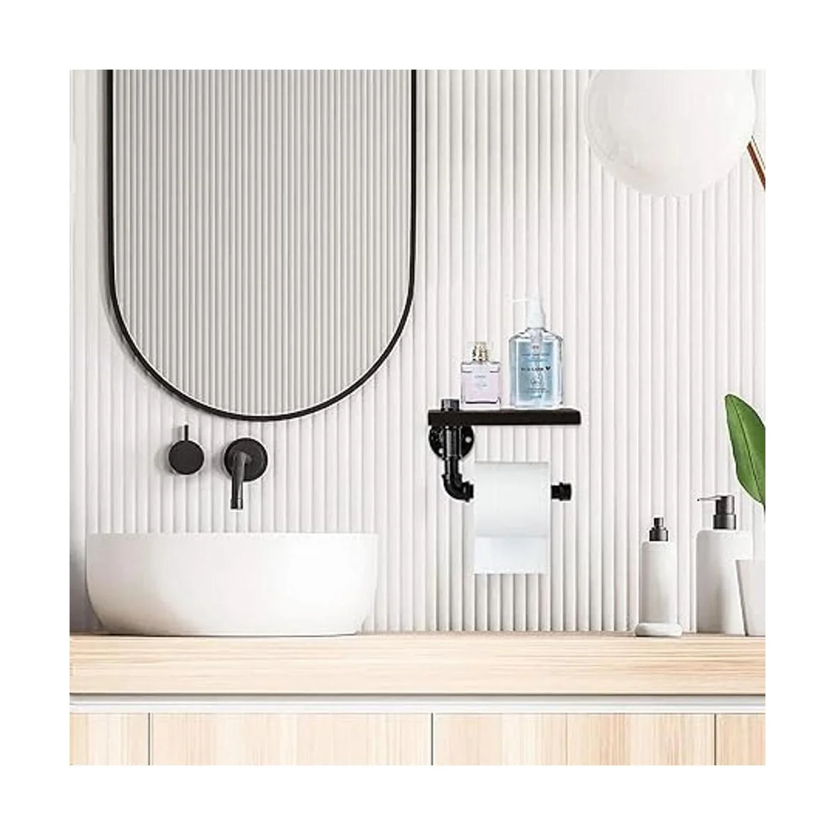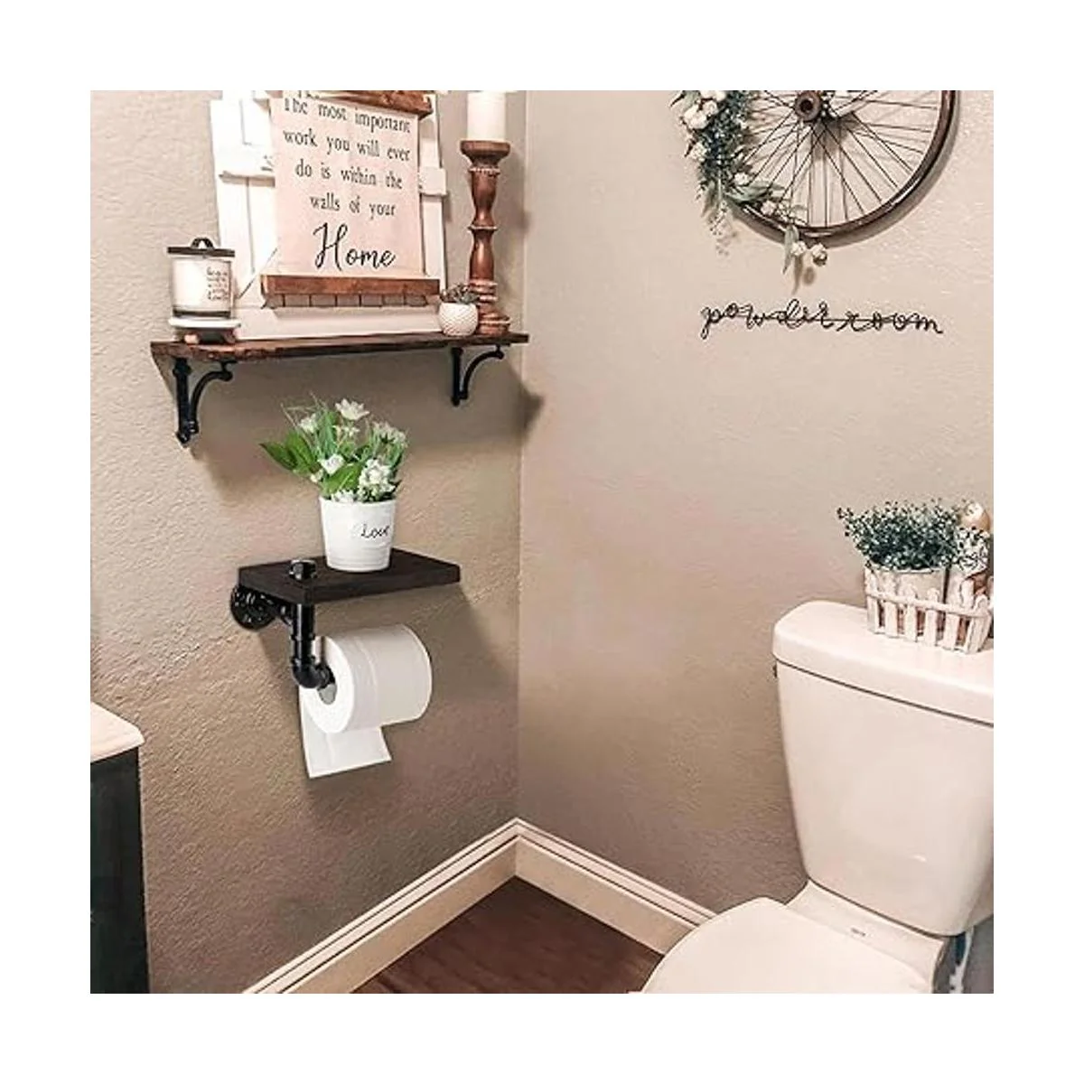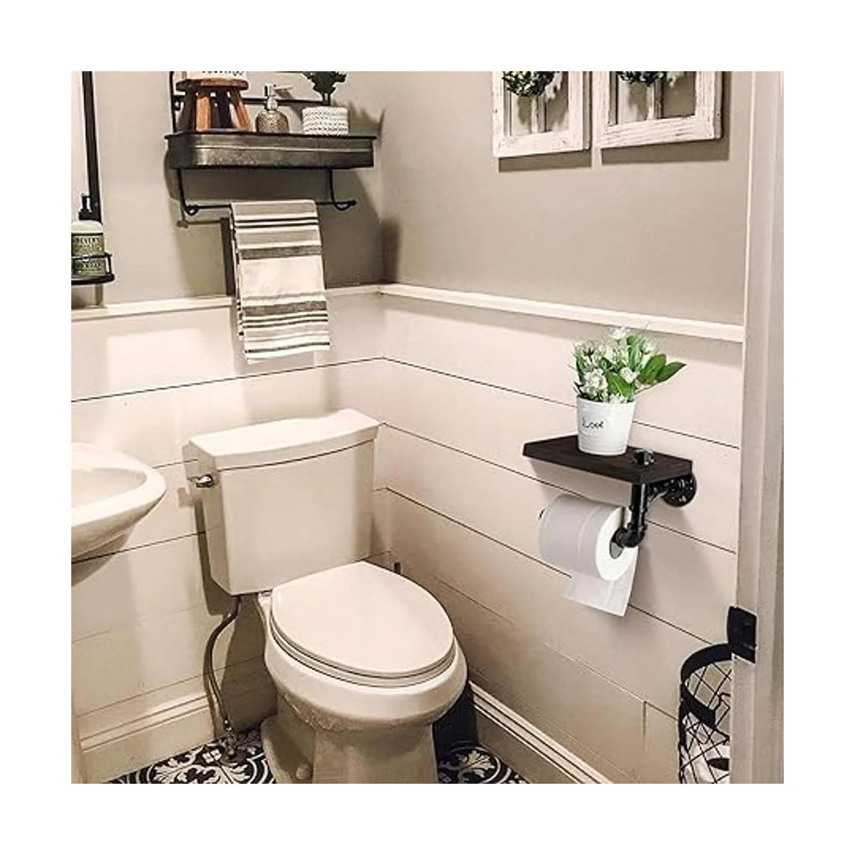 Luuuuucky Soporte de papel higiénico con estante, colgador industrial de pared con estante de madera rústico para baño, baño negro