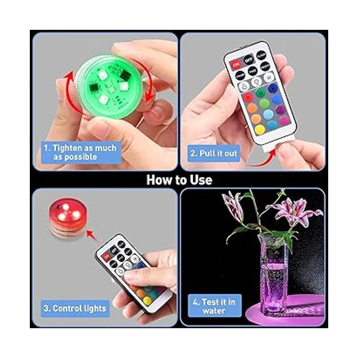 Crea un buen ambiente: un mando a distancia se puede utilizar para operar todas las luces al mismo tiempo. 13 colores diferentes y 4 modos para elegir, brillo y velocidad ajustables. Puedes configurar estas 10 luces LED subacuáticas para que sean de diferentes colores o del mismo color.