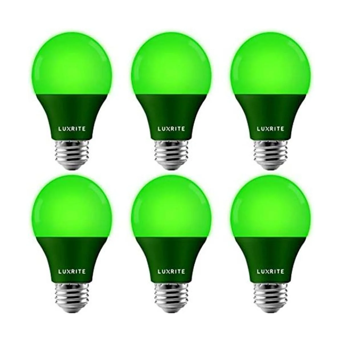 Luxrite Bombilla LED verde A19, equivalente a 60 W, no regulable, certificación UL, base estándar E26, interior y exterior, porche, Navidad, decoración, fiesta, vacaciones, eventos, iluminación del hogar paquete de 6