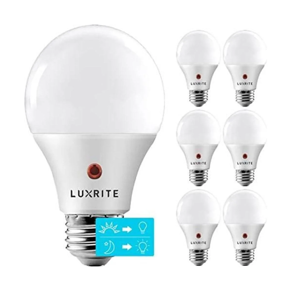 Luxrite Bombillas LED A19 del atardecer al amanecer, iluminación al aire libre, equivalente a 60 W, clasificación de accesorio cerrado, sensor de encendido automático de apagado, blanco suave de 3000 K, 800 lúmenes, clasificación húmeda, base E26 paquete de 6