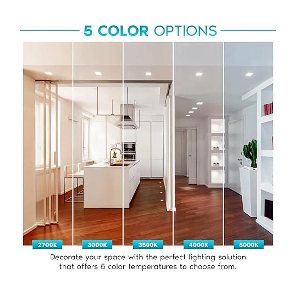 5 opciones de color: No estás seguro de qué temperatura de color de iluminación empotrada cuadrada estás buscando en tu hogar Cada luz LED regulable de 4 pulgadas tiene un interruptor fácil de usar en la parte posterior que puede cambiar tus luces a blanco cálido de 2700 K, blanco suave de 3000 K, blanco natural de 3500 K, blanco frío de 4000 K, blanco brillante de 5000 K. Las luces enlatadas de tu hogar serán ajustables a través de 5 temperaturas de color hasta que encuentres la luz perfecta para seleccionar para tu espacio.