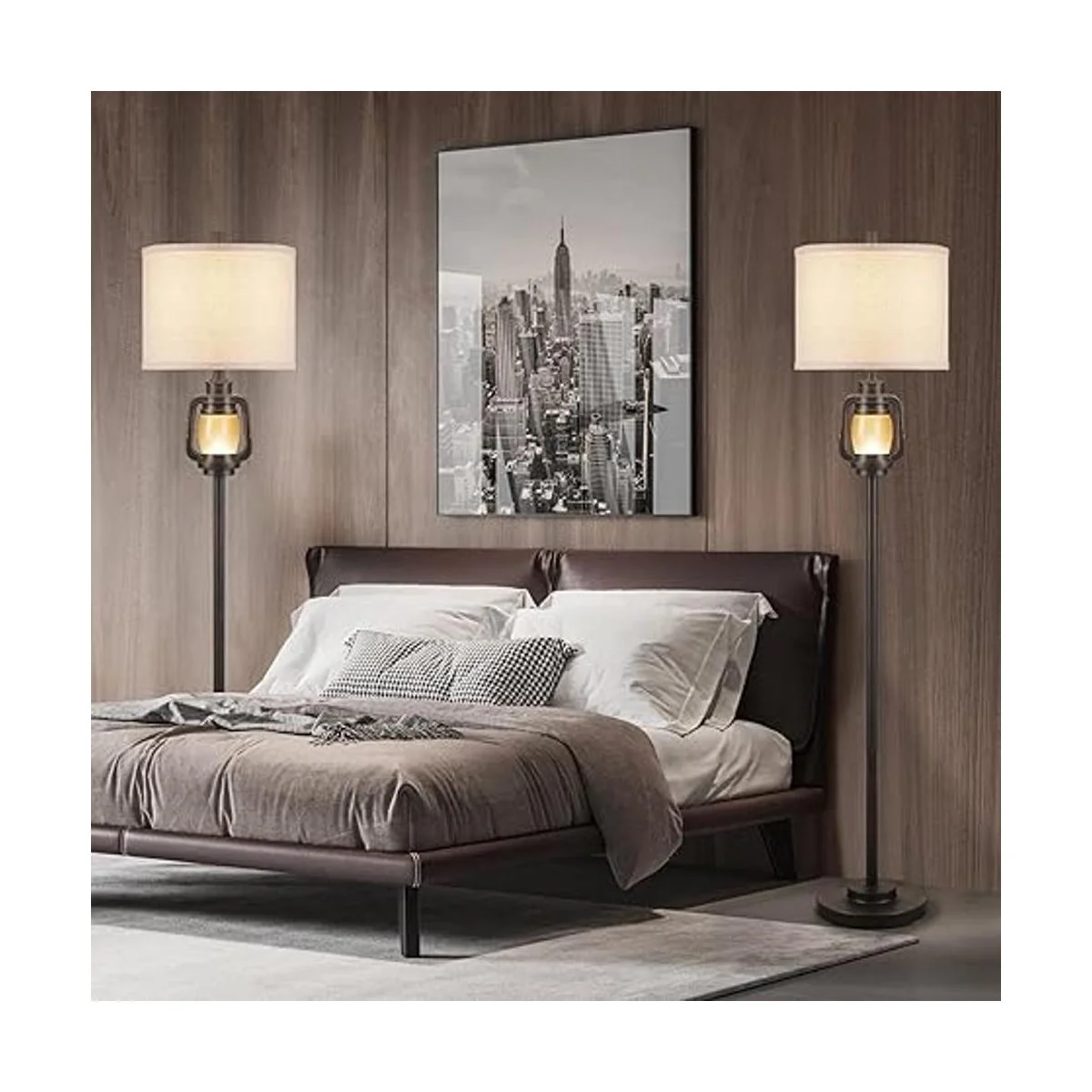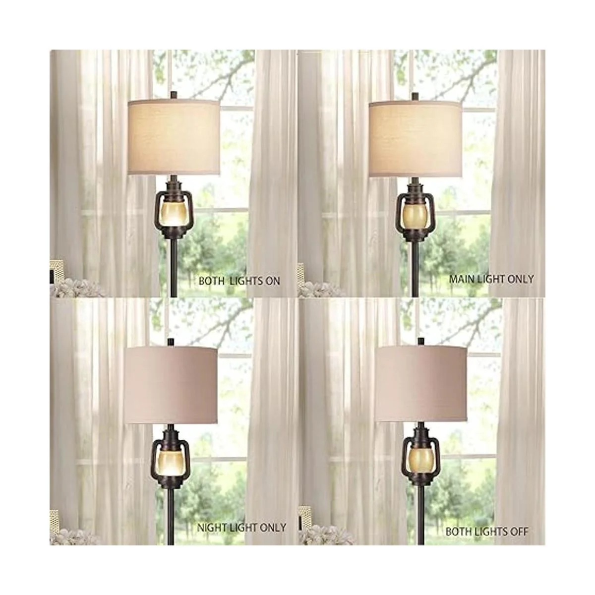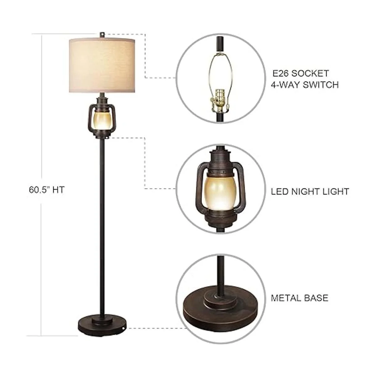 LuxSight Collection Lámpara de pie de farol con luz nocturna, acabado de bronce oscuro, tela de lino, decoración de sombra dura para sala de estar, lectura, casa, dormitorio, oficina en casa
