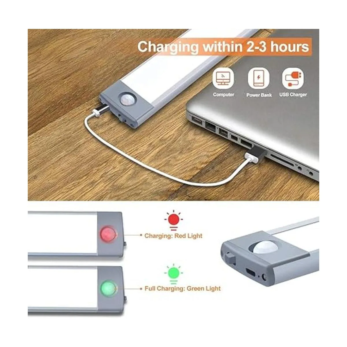 Batería incorporada de 2500 mAh, carga rápida, material mejorado, más duradero: La lámpara LED para clóset tiene incorporada una batería recargable de alta capacidad, por lo que no es necesario comprar baterías adicionales. Requiere 1 a 2 horas para cargarse y es fácil de cargar en un laptop o en una batería externa. Las lámparas LED para clóset se pueden utilizar de forma continua durante 5 horas en el modo de encendido y de forma continua durante 1 a 2 meses en el modo de sensor de movimiento. Un tiempo de uso muy prolongado