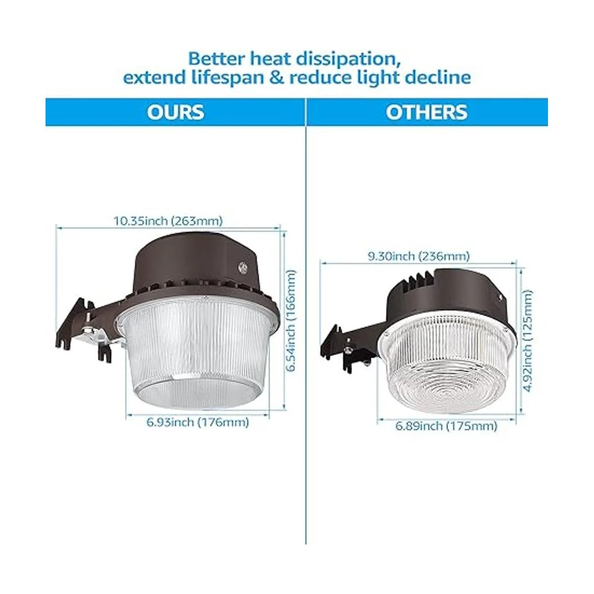 More Durable: Aluminum cooling fins enable stronger heat dissipation, and keeps the dusk to dawn security light maintain a more longterm and stable performance. The dark gray aluminum back housing is corrosion rust resistant and wont fade even for decades, granting this barn light a longlasting 50,000hrs lifespan