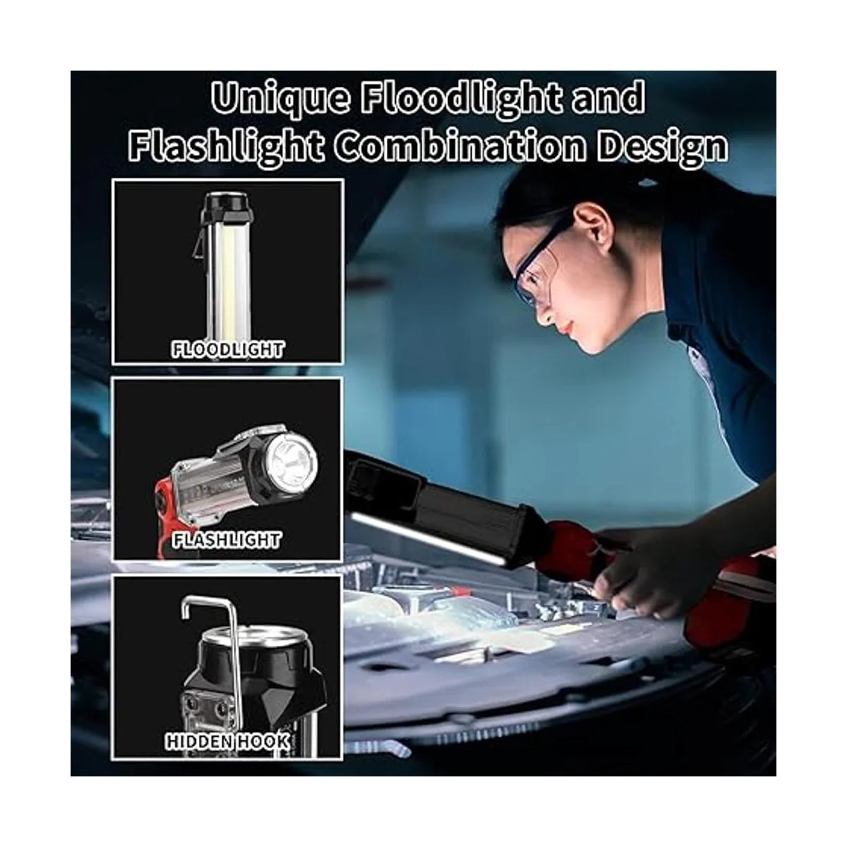 Luces de trabajo superbrillantes de 2000 lúmenes para mecánicos: vienen con fuente de luz COB, el diseño único de combinación de luz de trabajo y linterna realiza la combinación perfecta de linterna de foco y reflector. El diseño giratorio de 90 grados proporciona iluminación multiángulo, funciona perfectamente bien en lugares estrechos.