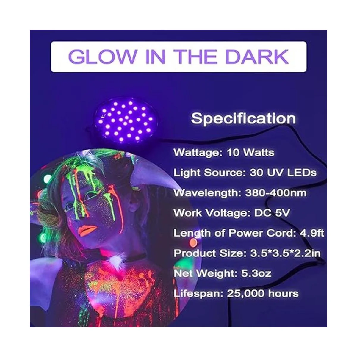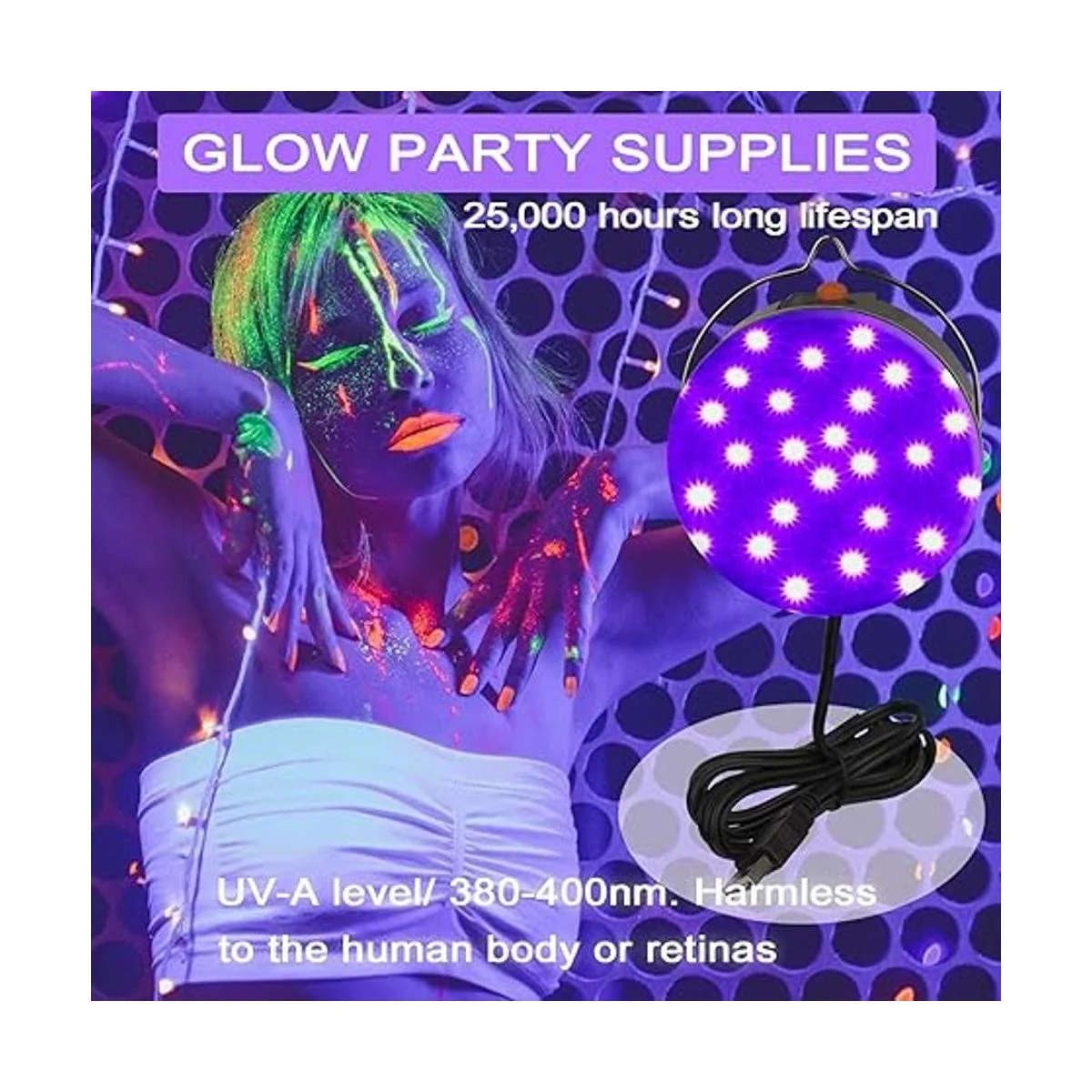 Luces negras UV en la oscuridad: nivel UVA/380400 nm lámpara de luz negra es inofensiva para la piel del cuerpo humano o las retinas, muy segura. La luz ultravioleta emitida por la luz negra hará que el material fluorescente parezca brillante.
