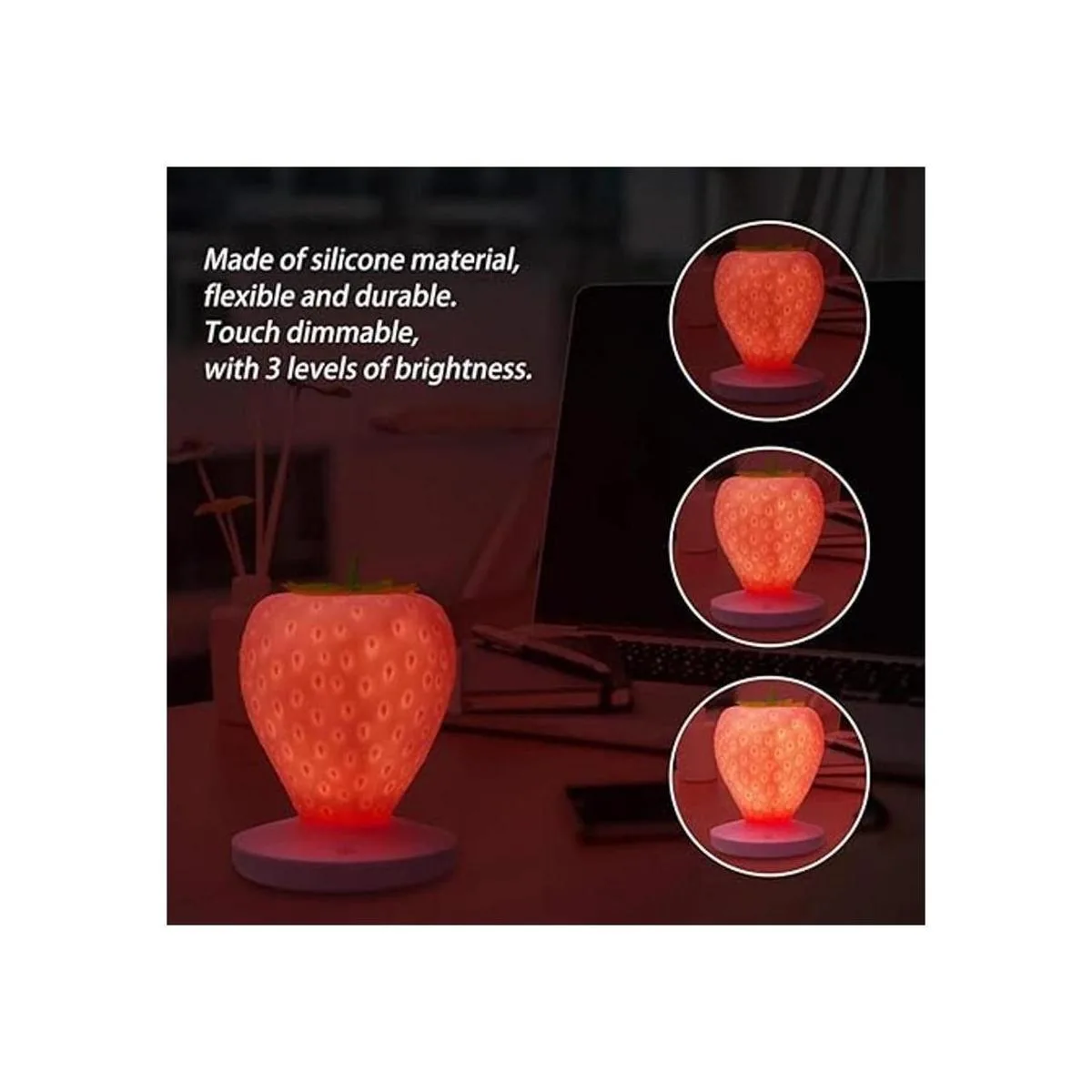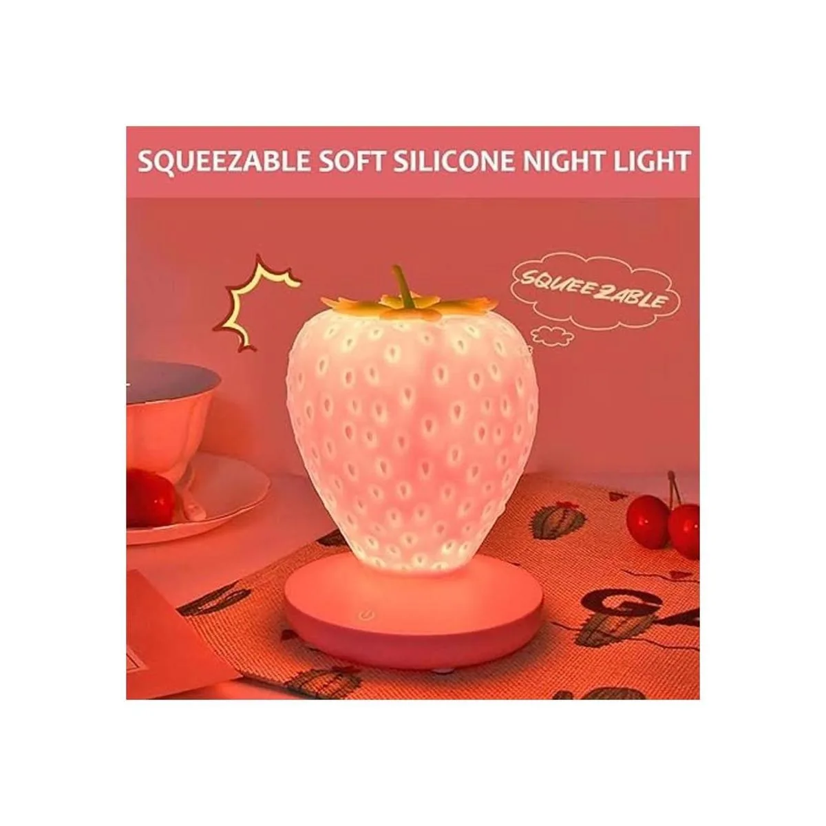 Material: la luz nocturna de fresa está hecha de silicona, flexible y duradera. Nuestra bonita luz tiene un tacto suave con el que puedes aliviar el estrés y liberar tus emociones. Y no te preocupes por dañar.