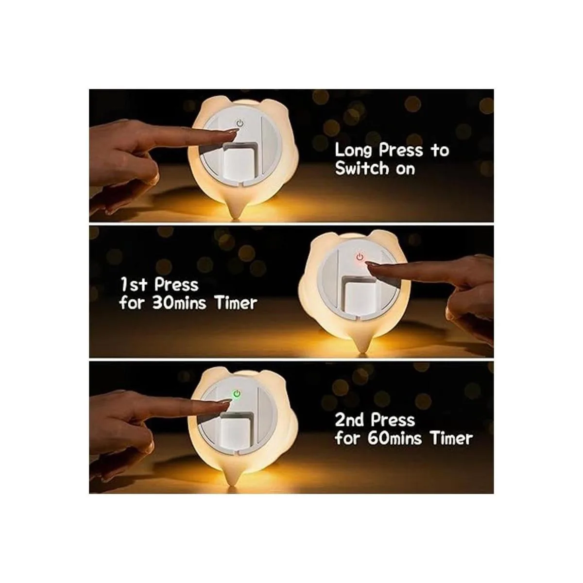 Presiona el control y temporizador: presiona el botón de encendido/apagado para encender la luz nocturna para niños. Presiona la luz nocturna en forma de cachorro para la habitación de los niños, para cambiar entre el modo de luz cálida estándar o el modo de rotación de 7 colores, puedes presionar firmemente la luz blanda para pasar por ellos. El modo de lámpara de noche para niños lo convierte en una atractiva lámpara de compañía para el cuarto de los niños. Incluso puedes controlar el brillo como desees o preajustar el tiempo de apagado a 15 o 30 minutos. Es fácil apagar la luz nocturna para bebé con el botón de encendido.
