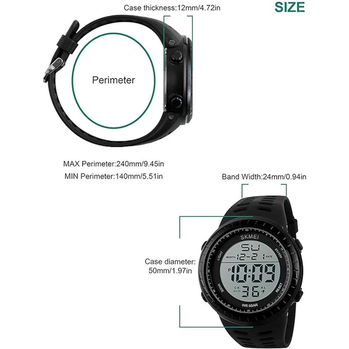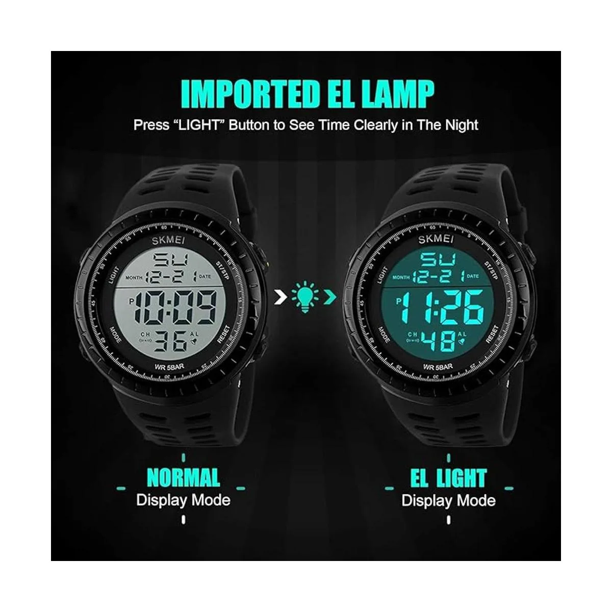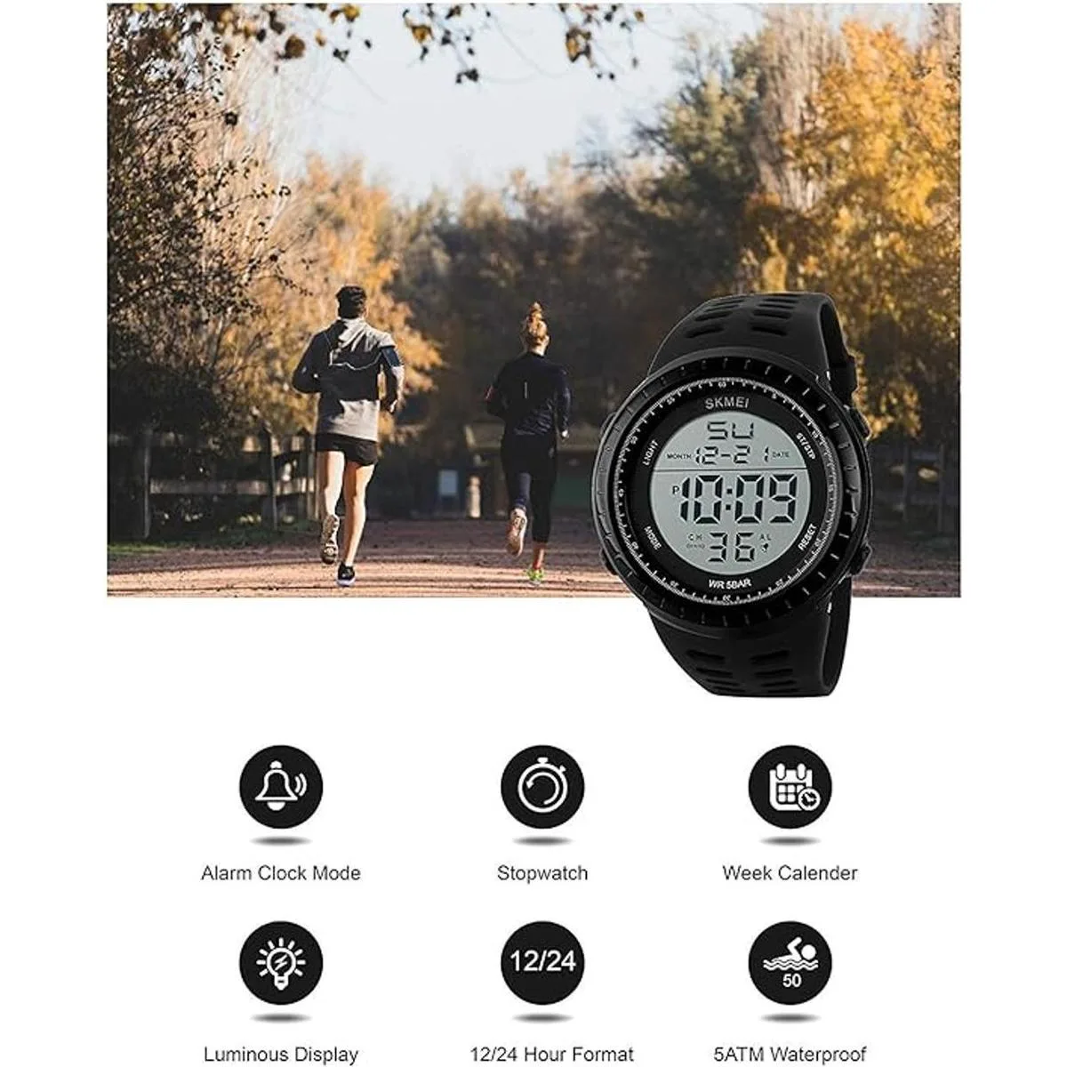 Diseño deportivo elegante, bisel y funda de resina, resistente al desgaste y ligero. Gran pantalla digital de retroiluminación.