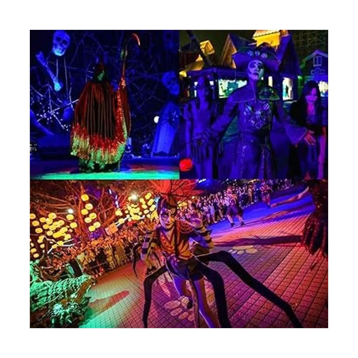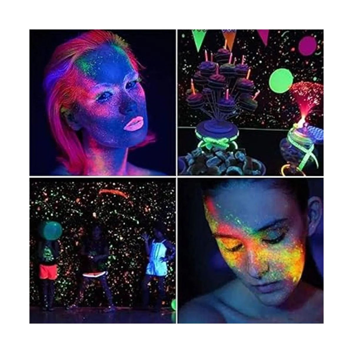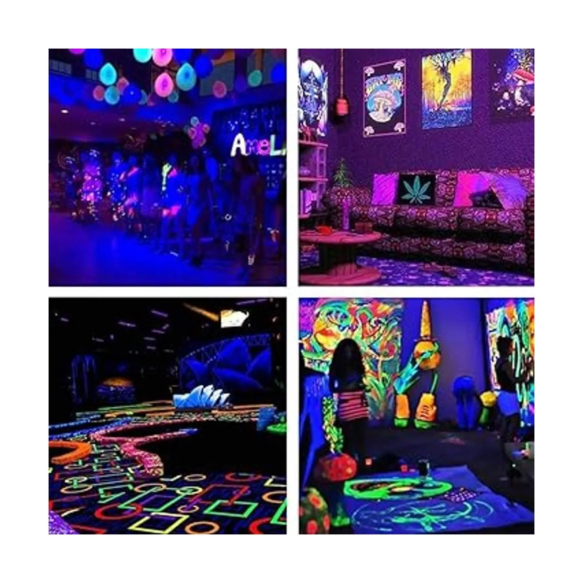 Reactivo fluorescente : las luces negras son esenciales para fiestas luminosas. Además, ideal para iluminar la mayoría de pigmentos, pinturas y tintes activos con luz negra. Especialmente para objetos de color neón, la luz negra es muy eficaz para pintura corporal UV y otros materiales fluorescentes visibles.