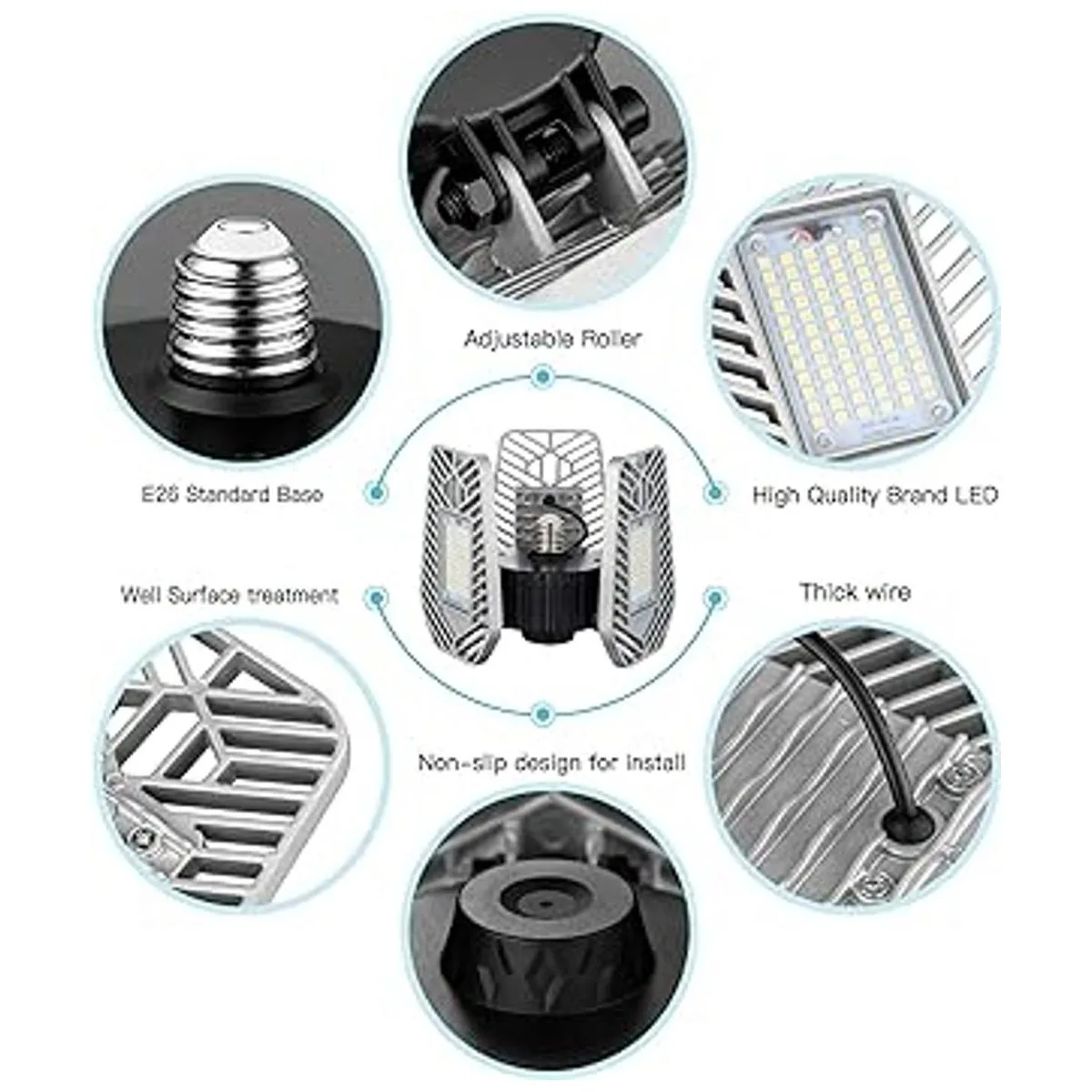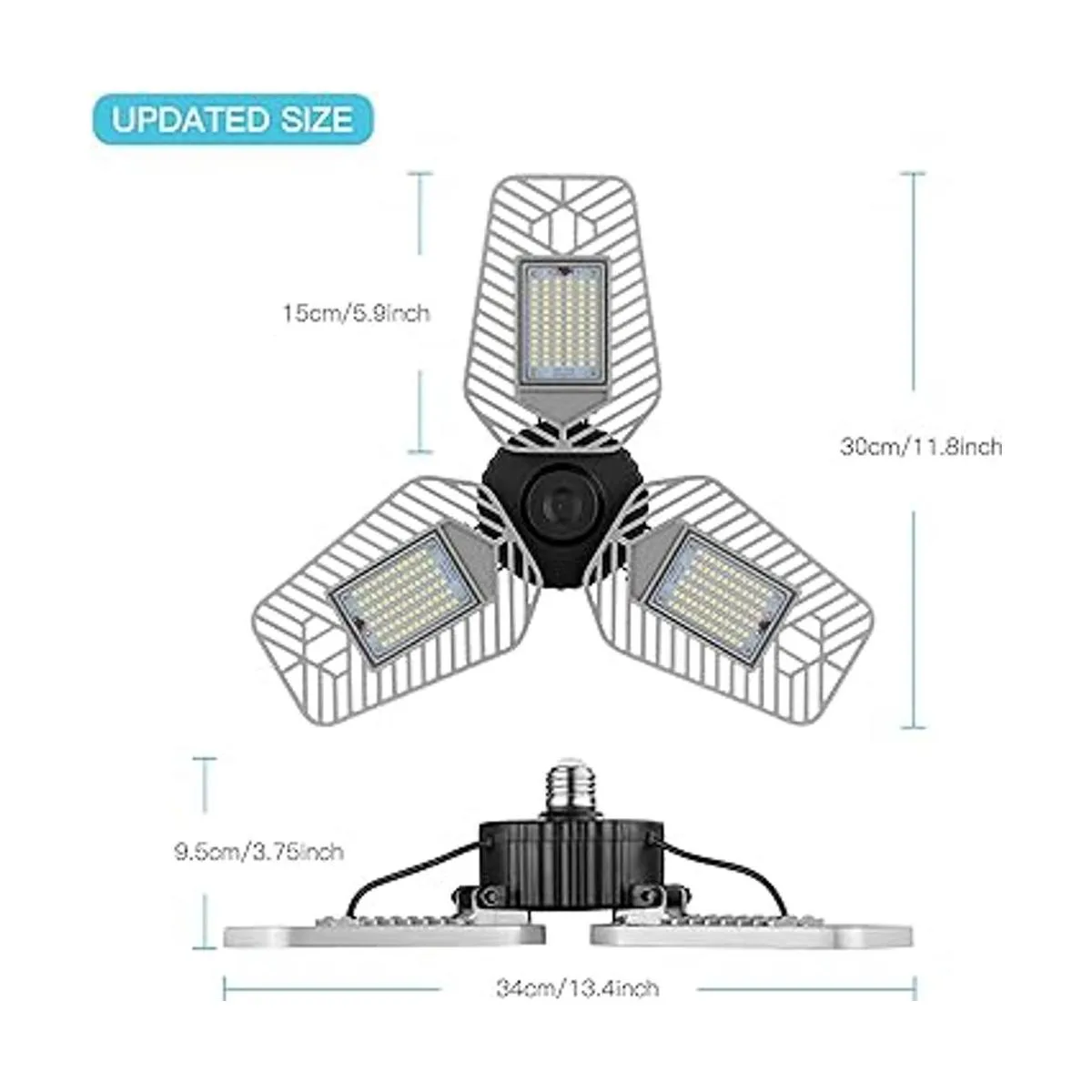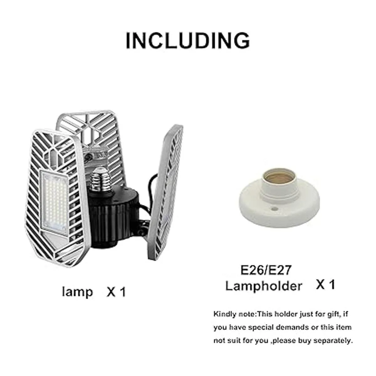 Diseño ajustable y fácil instalación: con 3 cabezales LED de aluminio ultra brillantes y diseño único de gran angular, fácil de ajustar para adaptarse a tus necesidades. El diseño de aluminio fundido acelera la disipación del calor, más sólido y más duradero. Las luces de garaje se pueden instalar en una base de tornillo estándar medio E26 tan fácilmente como atornillar en una bombilla de garaje. Nota: proporcionamos un portalámparas normal como un regalo gratis dentro del paquete.
