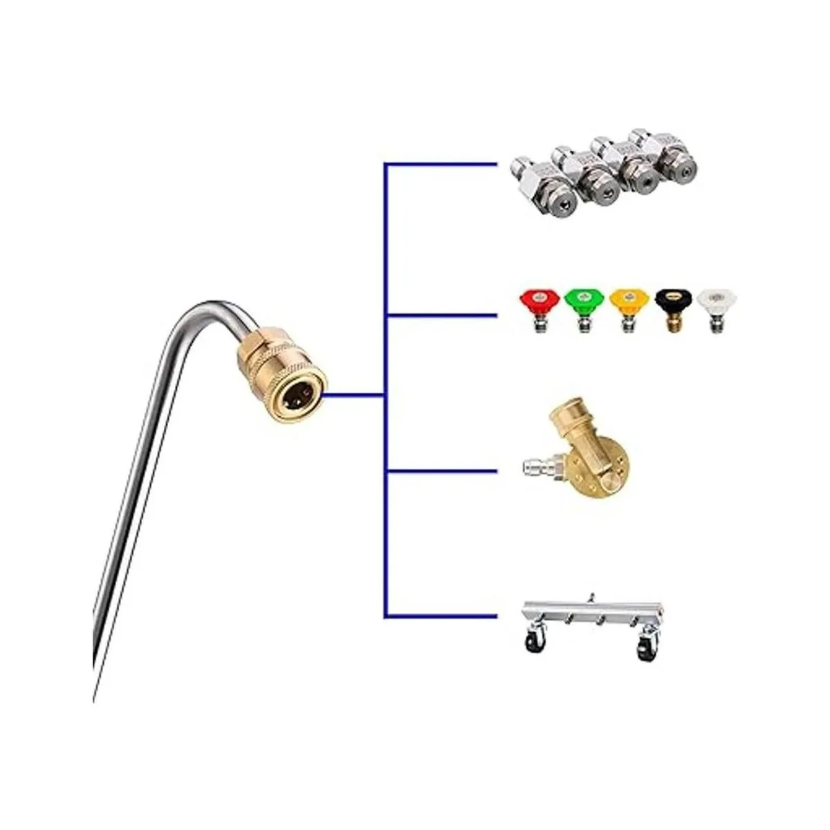 La herramienta de limpieza de canalones de lavado a presión está hecha de acero inoxidable duradero. La presión de trabajo es de hasta 4000 PSI.