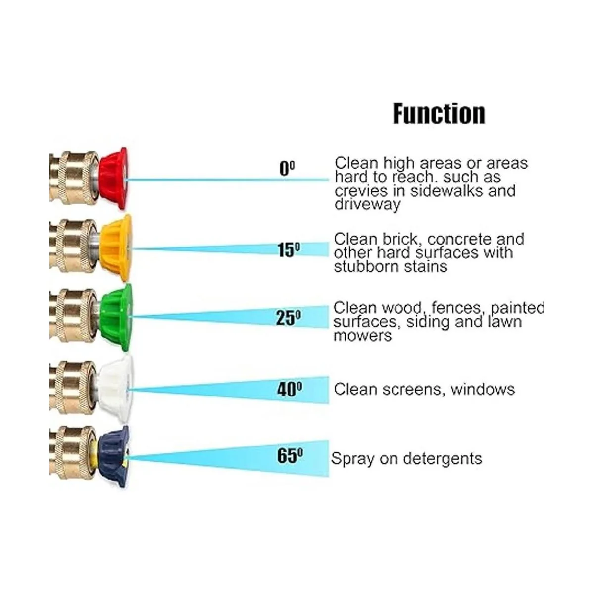 5 puntas de boquilla: tienen diferentes ángulos 0, 15, 25, 40, 65 grados. Elige diferentes boquillas de acuerdo a tus necesidades. Como regar flores y plantas, lavar el coche. Presión máxima de hasta 4000 PSI.