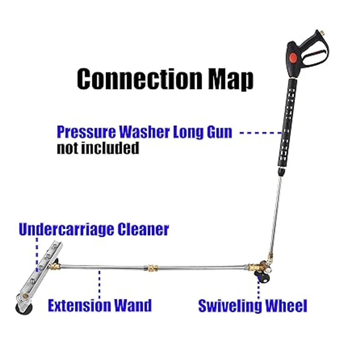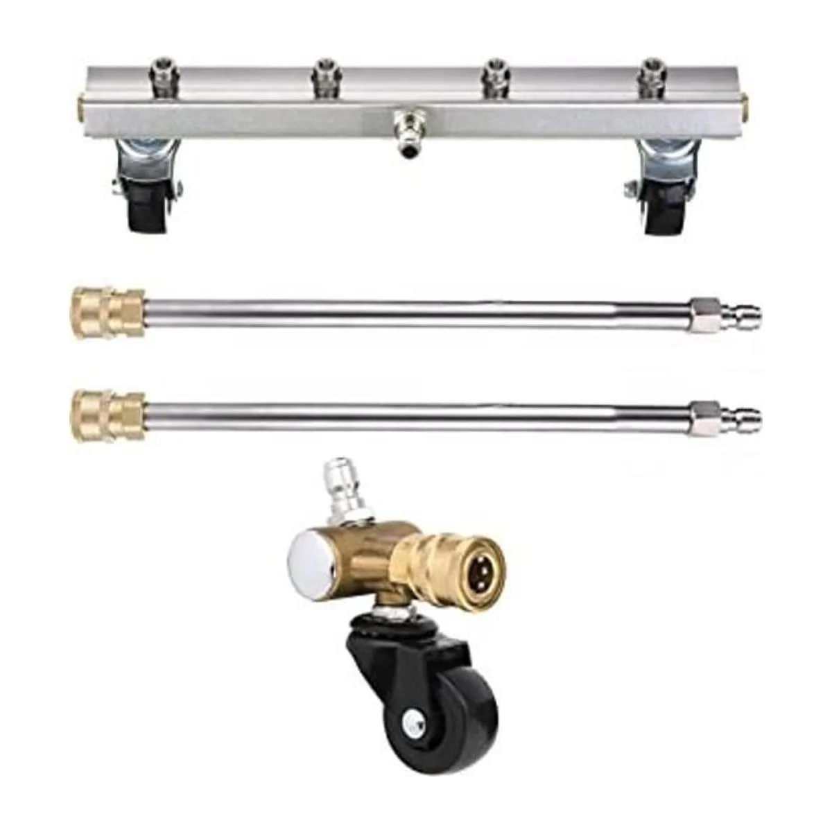 Contenido del paquete: un limpiador debajo de 13 pulgadas, una rueda giratoria y dos varitas de extensión recta de 13.5 pulgadas. El limpiador del tren de rodaje funciona para lavadora de agua fría y caliente. Tiene 4 boquillas y 2 ruedas.