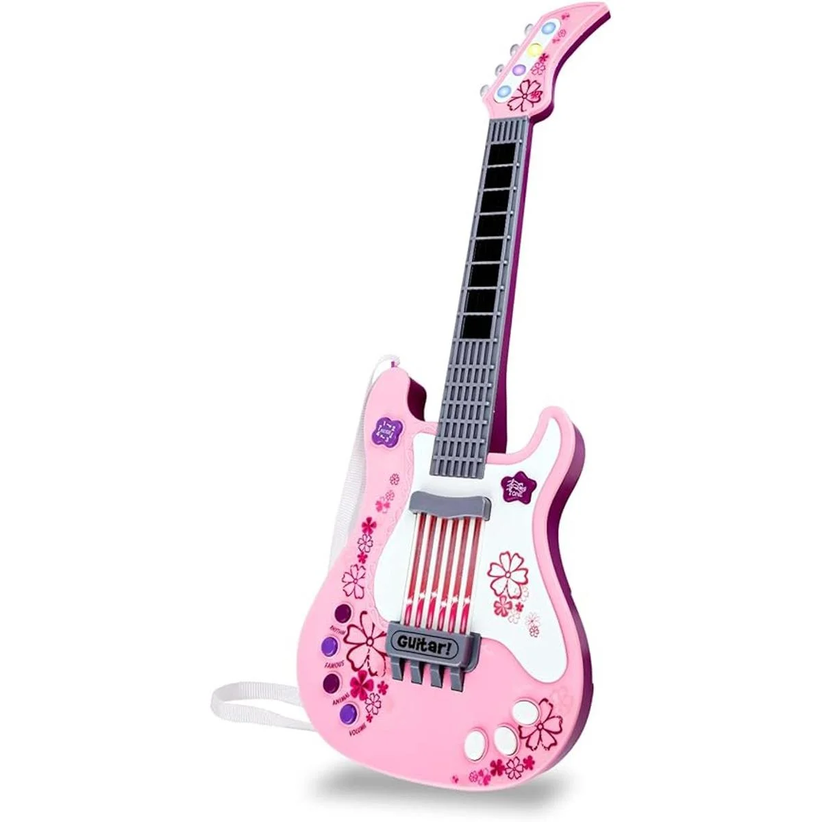 Guitarra portátil para niños El juguete de guitarra funciona con 3 pilas AA no incluidas y equipado con correa trasera. El tamaño perfecto y el peso ligero son adecuados para que los niños lo lleven a cualquier lugar.