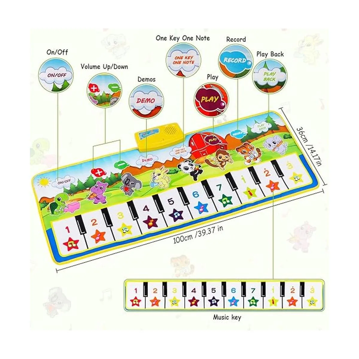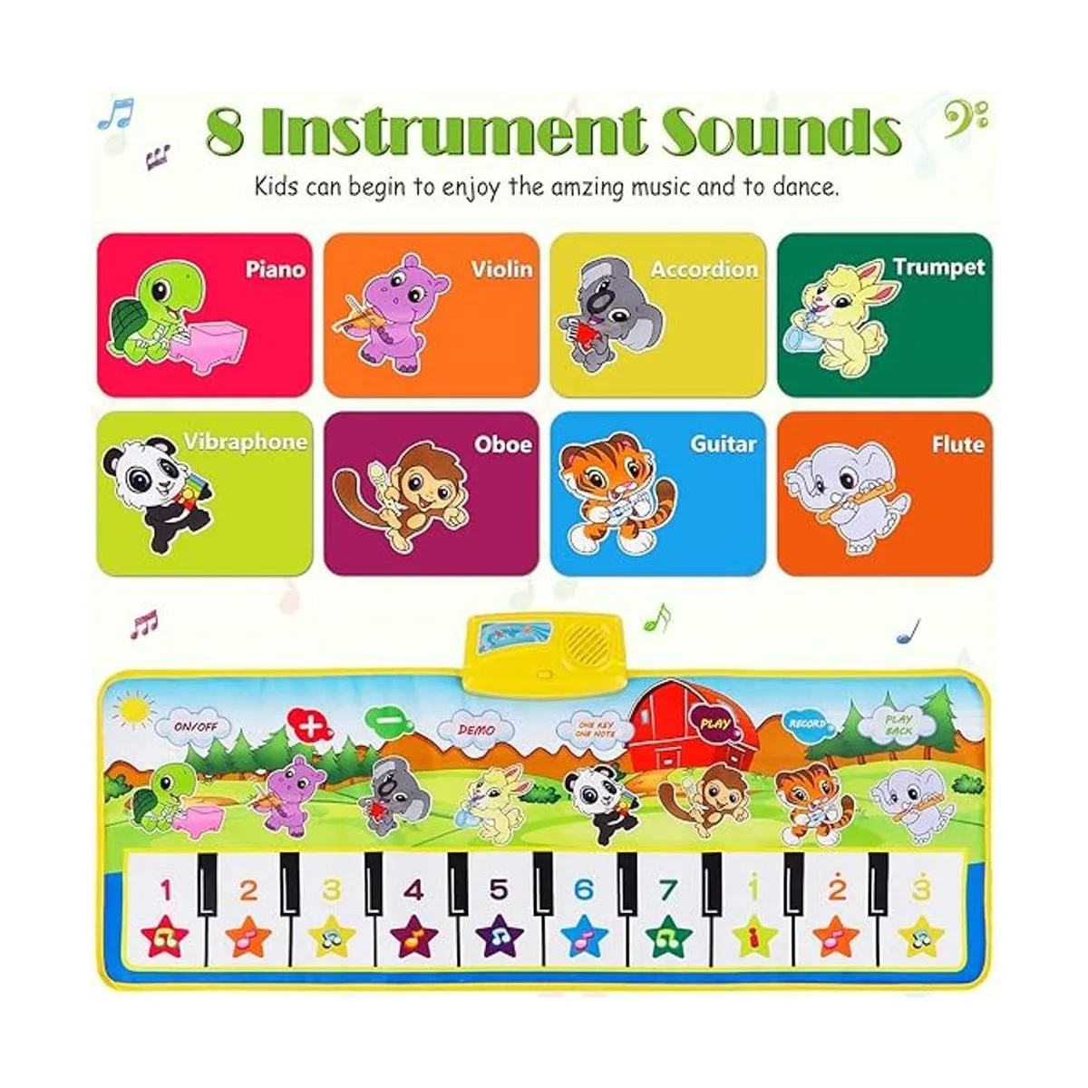 8 sonidos de instrumentos y 10 teclas: tapete musical con 10 teclas de piano, 8 sonidos de instrumentos musicales piano, violín, acordeón, trompeta, vibráfono, oboe, guitarra, flauta, 10 demostraciones, una nota clave, función de grabación y reproducción. La alfombrilla de piano Sanmersen puede estimular el desarrollo auditivo de los niños, ayudar a identificar colores, animales y notas.