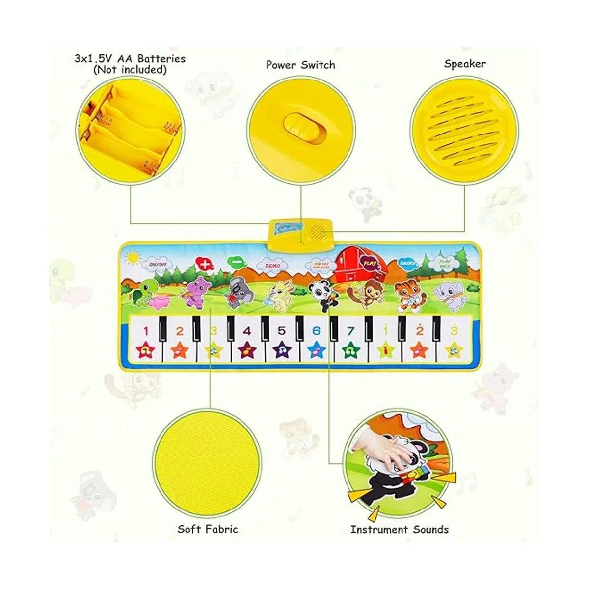 3 pilas AA de 1,5 V. Alimentadas: tapete de piano para niños alimentado por 3 pilas AA de 1,5 V no incluidas, simplemente instala las baterías y luego enciende el interruptor de alimentación para jugar. La alfombrilla de juego táctil se puede jugar con manos o pies, inspira la capacidad deportiva del niño y ejerce la coordinación de la mano y el ojo del bebé.