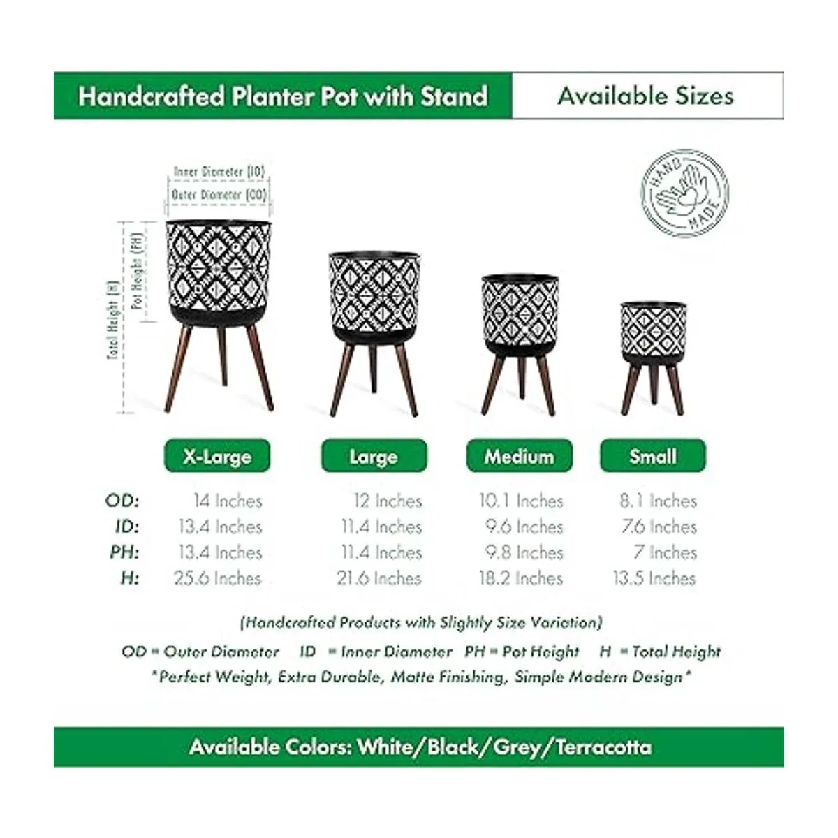 Juego de maceta extragrande con soporte: tamaño de maceta: 14 pulgadas; diámetro interior de la maceta: 13.4 pulgadas; maceta con soporte altura total: 25.6 pulgadas.