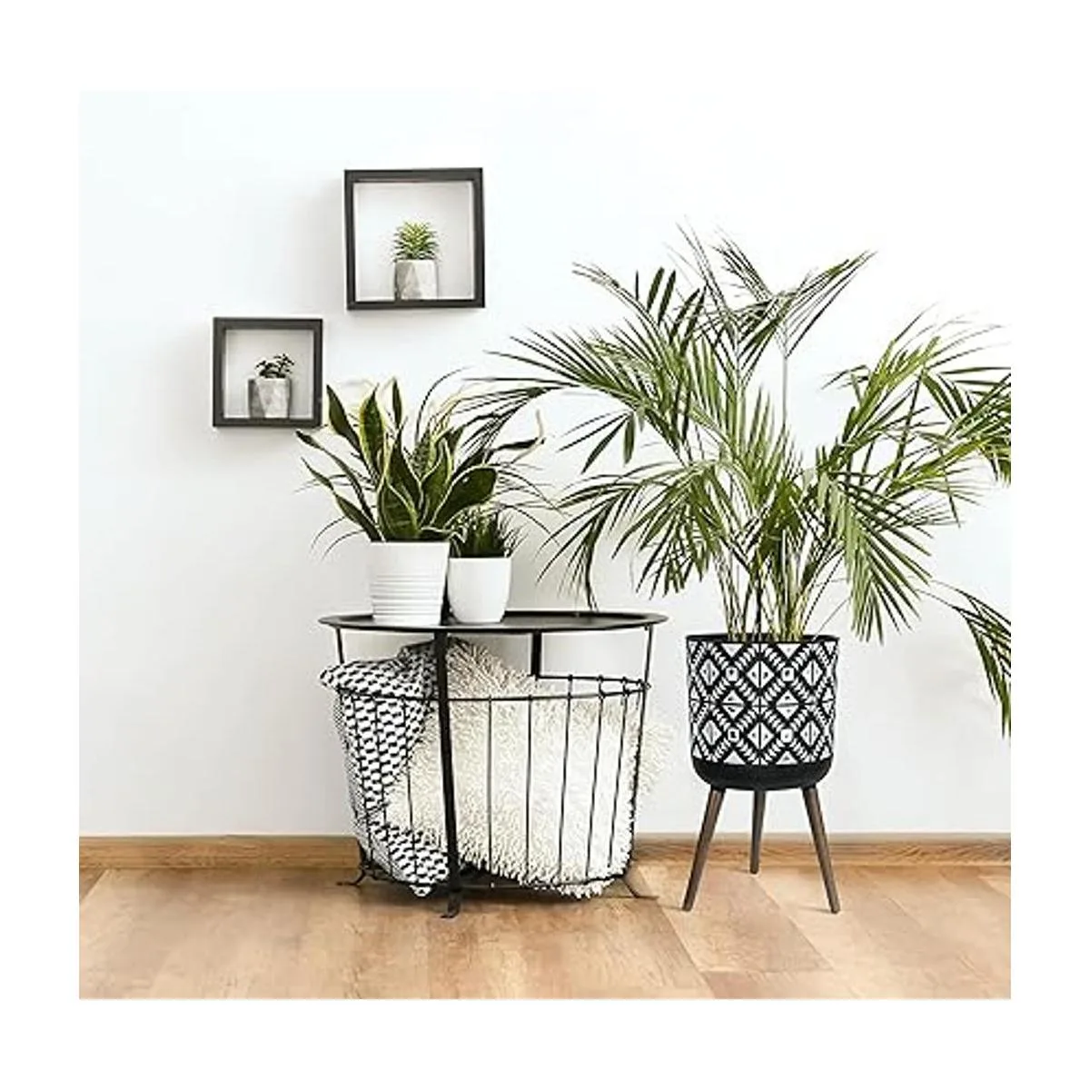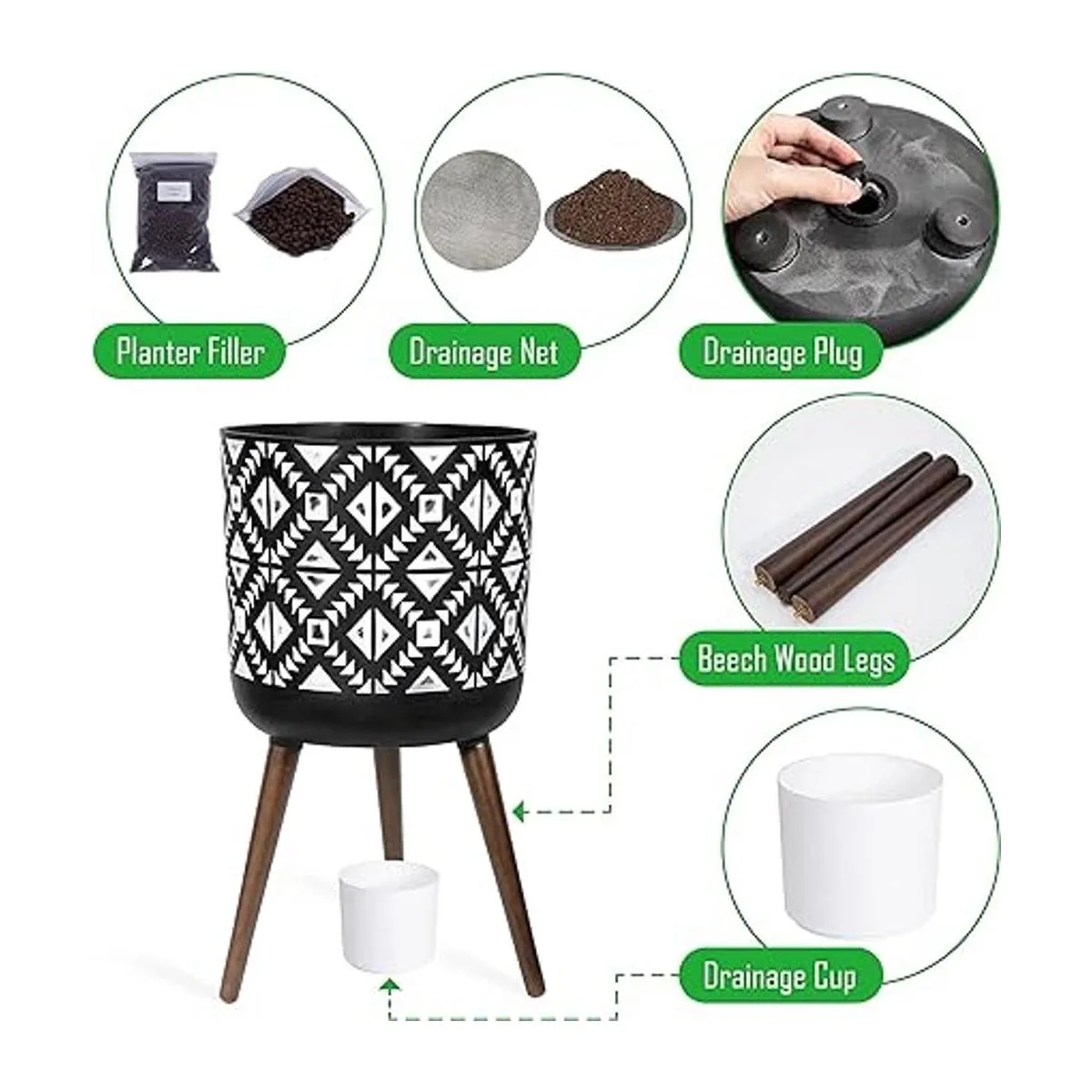 Contenido del paquete: maceta con orificio de drenaje, tapón de drenaje, juego de soporte: 3 patas de madera maciza.