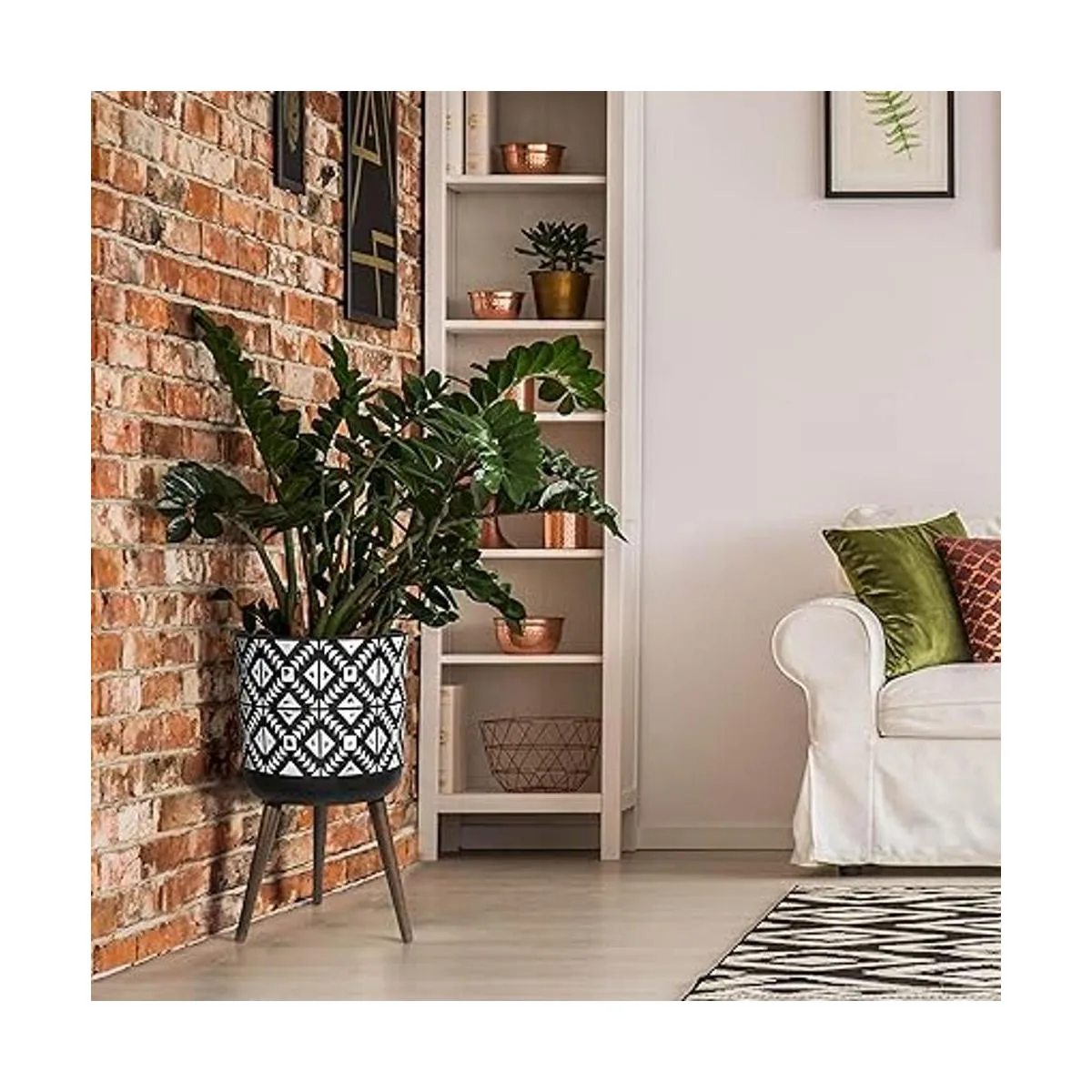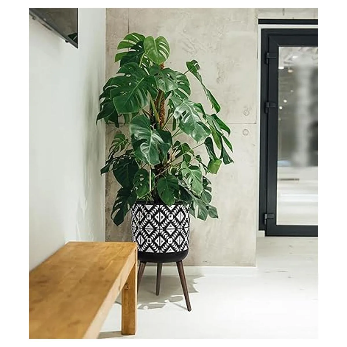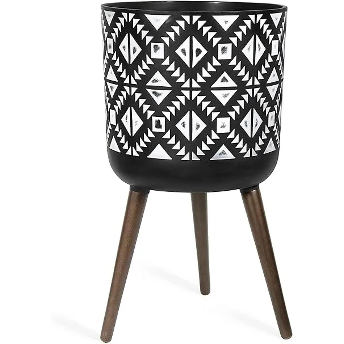 Maceta moderna de fibra de arcilla duradera hecha a mano con soporte, diseño geométrico con gris carbón/blanco.