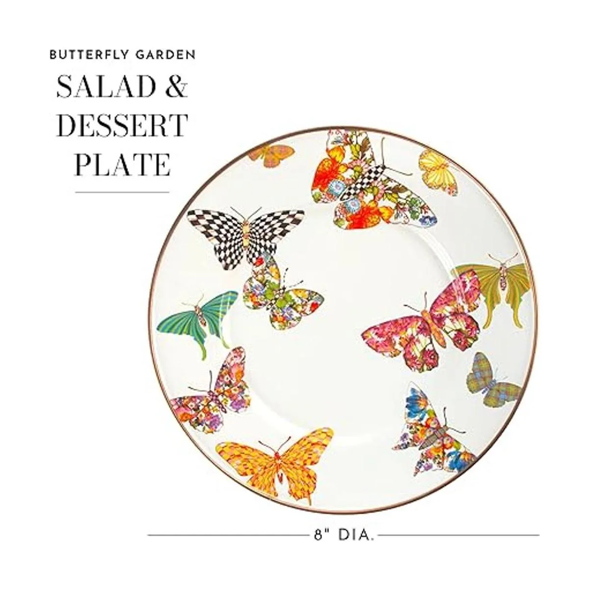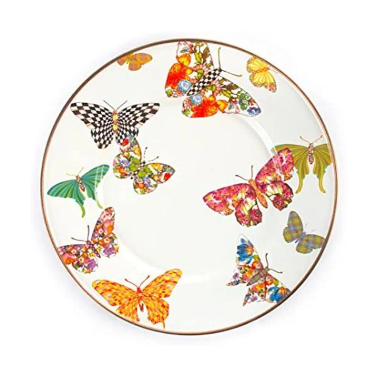 BUTTERFLY GARDEN DINNERWARE: This lovely enamelware plate is bespeckled with handapplied butterflies, all in our signature patterns. Look for a flurry of color in red, blue, pink, green, and of course, the beloved blackandwhite Courtly Check.