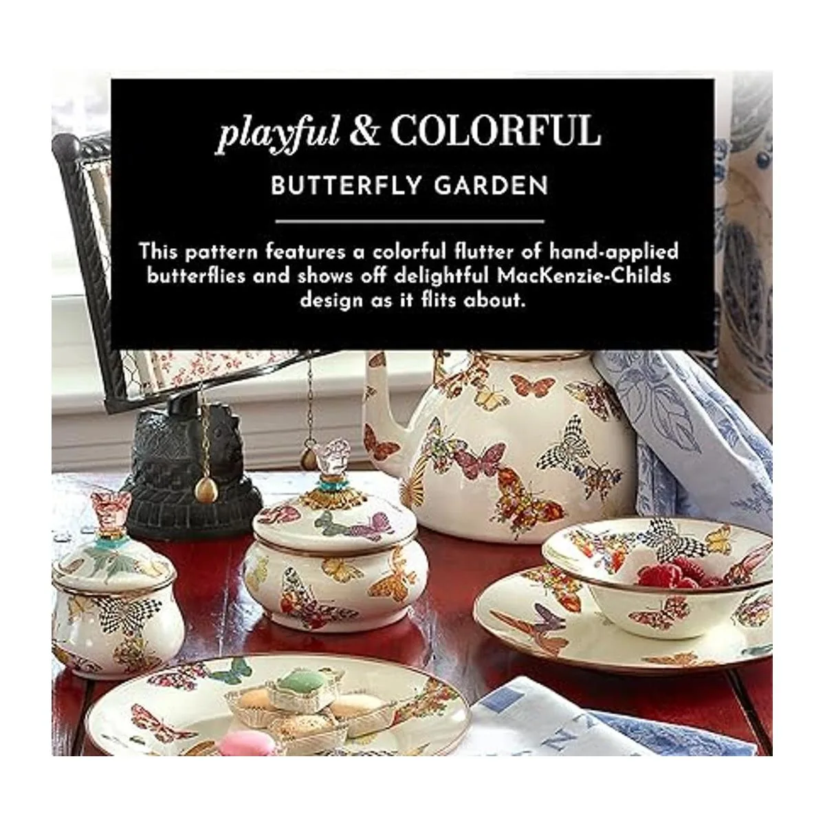 KITCHEN ACCESSORIES: At MacKenzieChilds, we believe that everyday items can be made extraordinary. Enjoy the magic of our Butterfly Garden Collection on serving platters, salad plates, coffee mugs, and the signature MacKenzieChilds teapot.