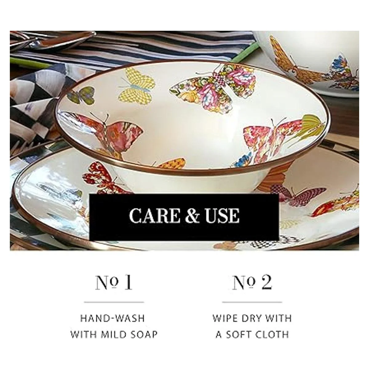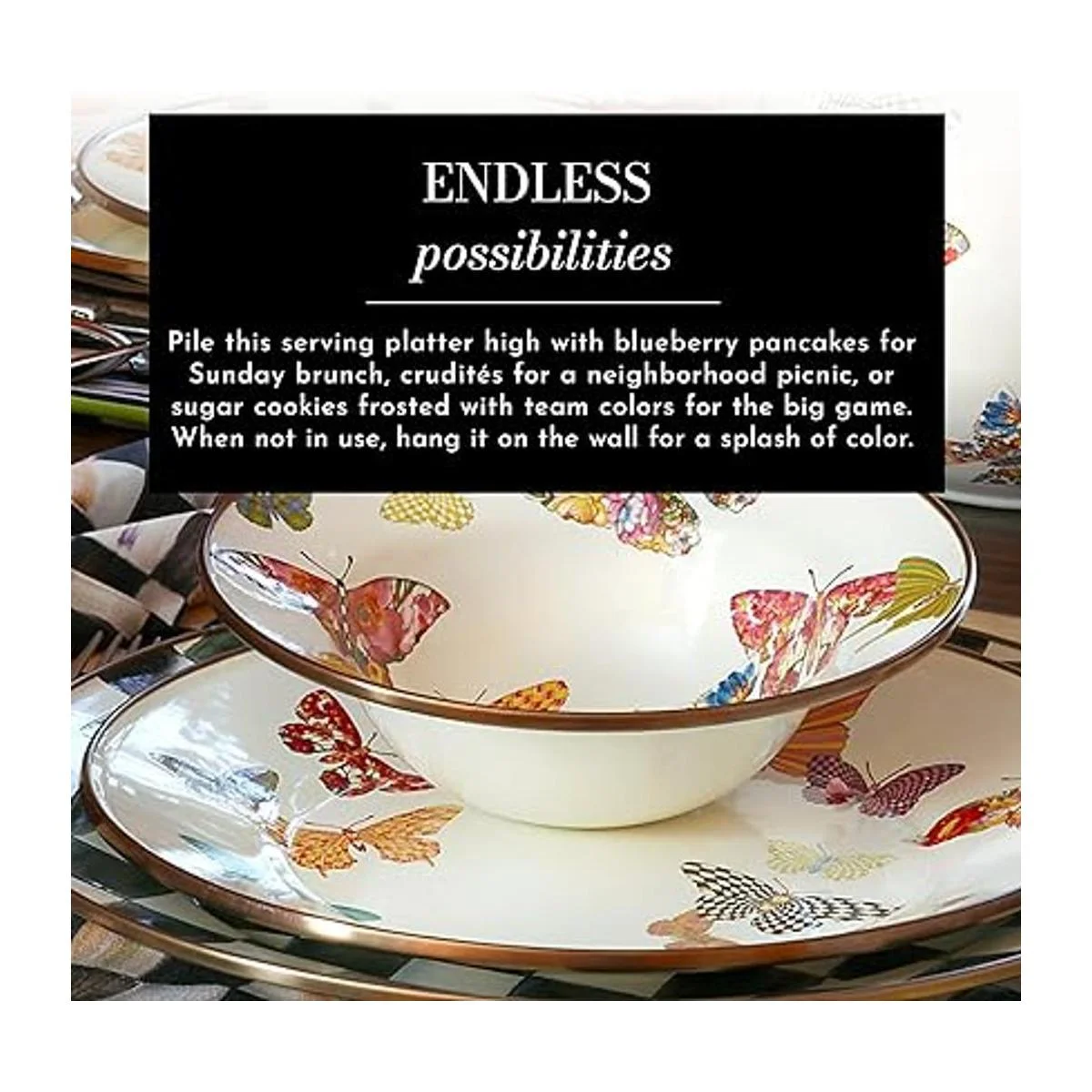 Vajilla de jardín de mariposas: este bonito plato de esmalte está hecho a medida con mariposas aplicadas a mano, todo en nuestros patrones distintivos. Busca una ráfaga de color en rojo, azul, rosa, púrpura y, por supuesto, el querido cheque cortés en blanco y negro.