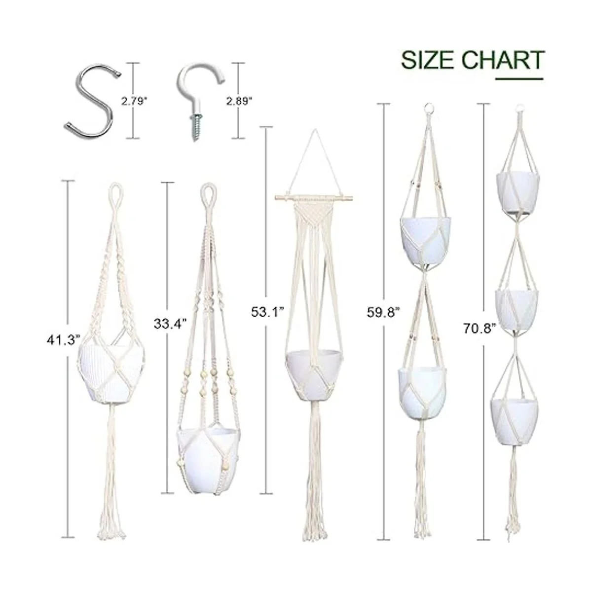 El paquete incluye: cada paquete incluye 5 soportes para plantas colgantes de diferentes estilos, 5 ganchos de techo y 5 ganchos en forma de S, adecuados para colgar plantas. Los ganchos de macramé para plantas con diferentes tamaños, la longitud de cada uno es de aproximadamente 70.9 in, 59.1 in, 53.1 in, 41.3 in, 33.5 in, y los ganchos de techo son de 2.9 in, los ganchos en S son de 2.8 in. Planta y macetas no incluidas