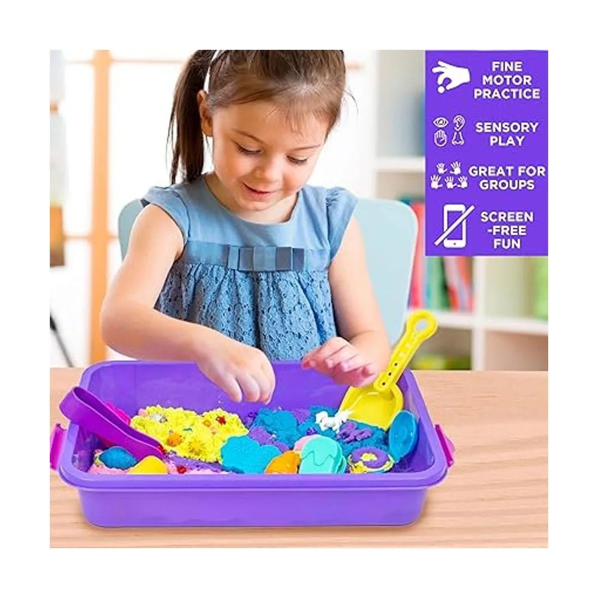 Diversión sensorial todo en uno: abre el contenedor para encontrar 24 oz. Moldeable, elástico, arena expandible, una pala, docenas de cuentas con baches, moldes caprichosos, pinzas y mucho más. Juega dentro de la funda, luego úsalo como un espacio de almacenamiento