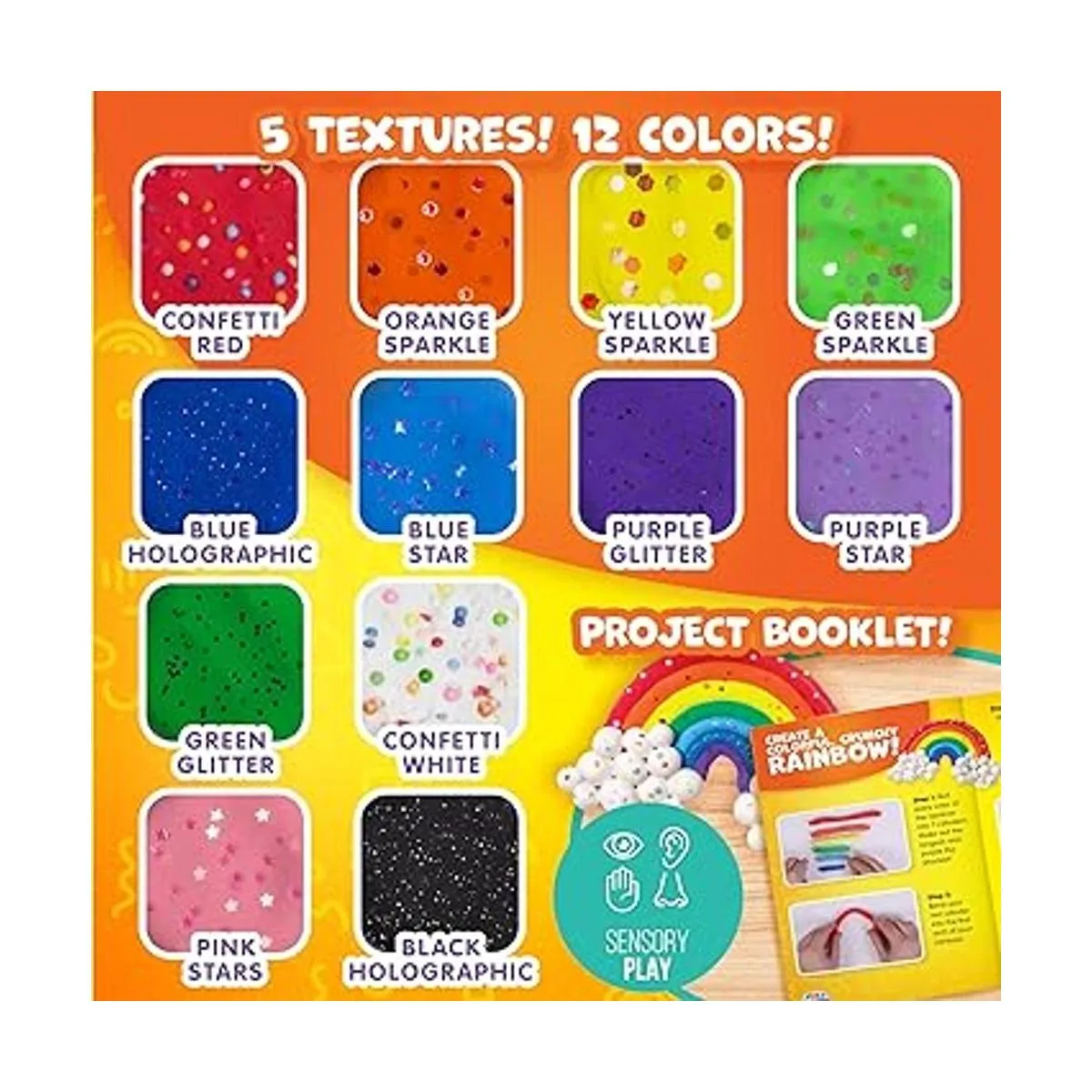 Incluye 12 onzas. De arcilla texturizada y seca al aire: con 12 colores diferentes del arco iris y complementos súper crujientes como mini bolas de espuma arcoíris, prepárate para experimentar la textura preparada sin la preparación adicional